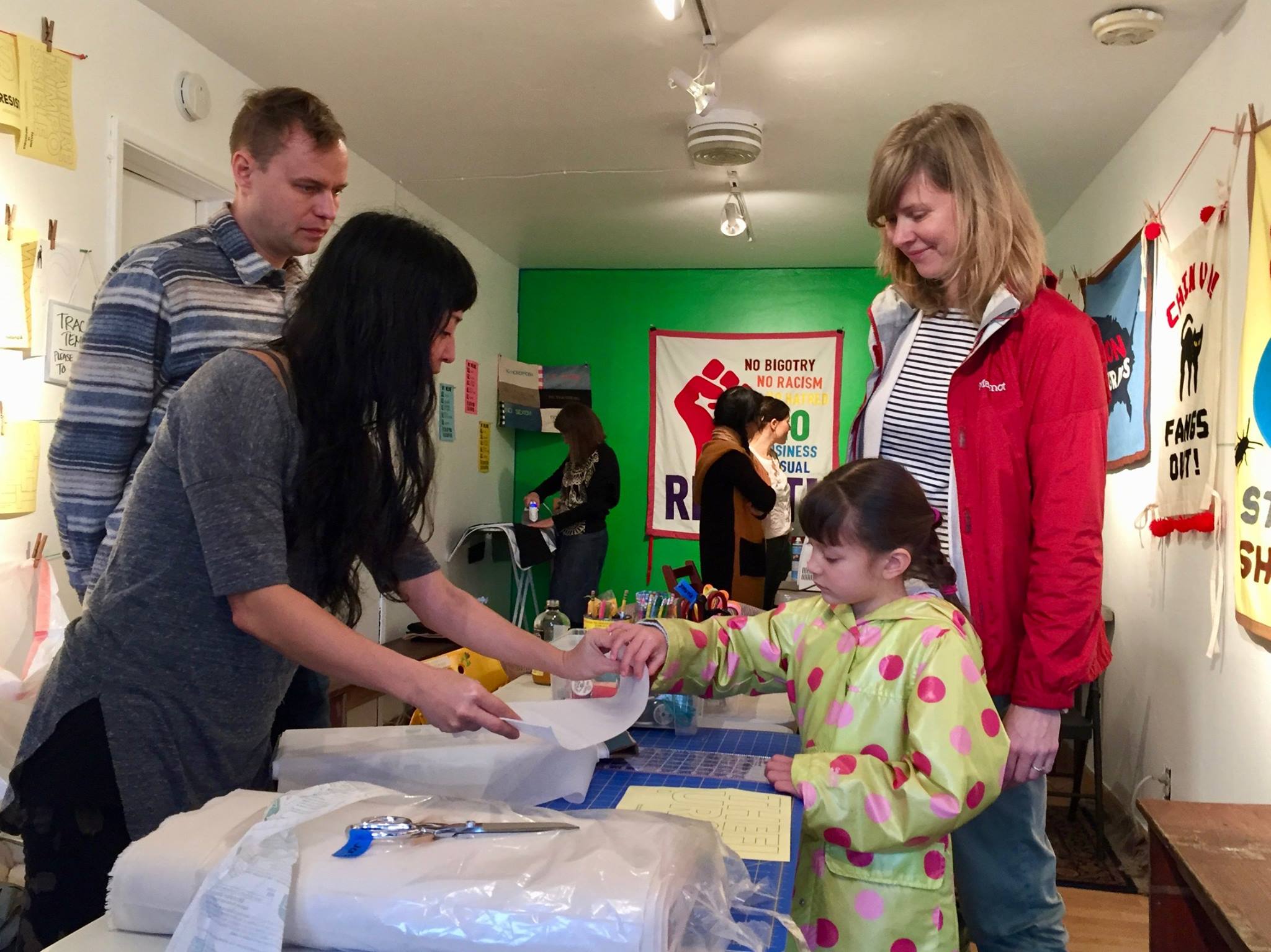 - 100 days of Action artists gather at the Royal Nonesuch Gallery in Oakland hosting a protest banner making workshop with artist Stephanie Syjuco on Sunday, January 8, 2017. (Photo courtesy of 100 Days Action)