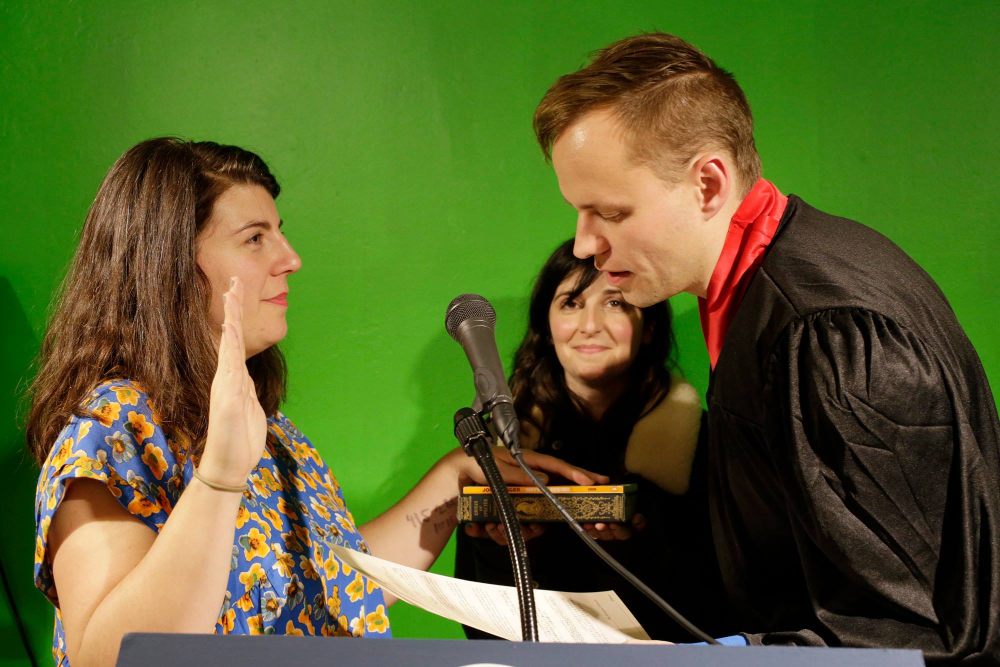 - Maysoun Wazwaz takes a presidential oath to “faithfully execute her role as Boss Lady of the United States” in front of “judge” and artist Jeremiah Barber at the Royal Nonesuch Gallery at the Inauguration Ball on Friday, January 20, 2017. (Photo courtesy of 100 days Action-Victoria Heilweil)