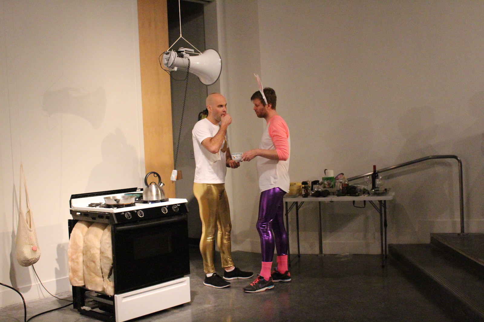 Minutes later, Maak, in metallic gold tights and full evening make-up, used a megaphone hanging on top of a stove to welcome guests to their art collaboration, “Technologies of the Kitchen.” The exhibit, hosted by Pro Arts Gallery in Oakland, is a collection of curious things: kitchen implements, embroidered leather, and hospital dividers. In one corner stands a table with pans, condiments, food, cups, instant coffee powder, bottle, glasses, and knives, reminiscent of Martha Rosler’s Semiotics of the Kitchen, an enigmatic 1970s black-and-white video that has feminist underpinnings. In another corner, glazed ceramic plates are glued to the wall. In three corners are representations of burning: a matchbox inside a glass case, boiling water on the gas stove, and a film clip of burning cars projected on an oven door.