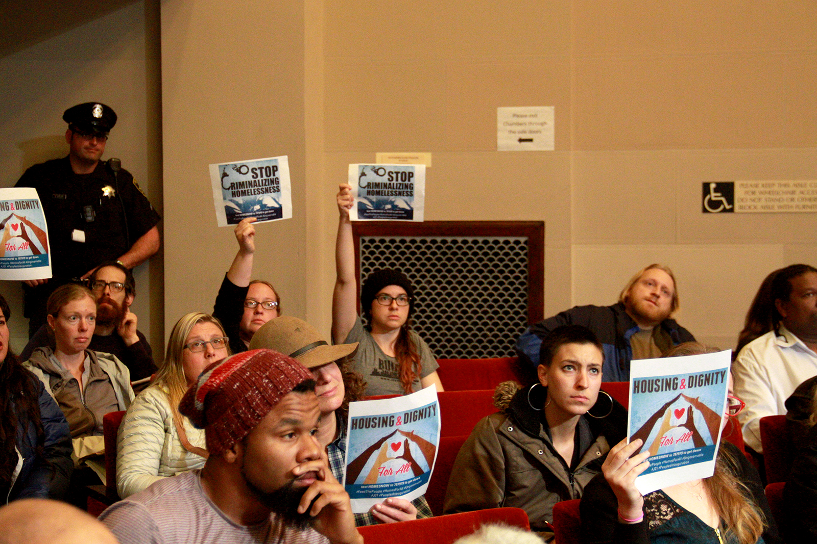 One third of the public seats were filled by protestors advocating for the encampment, holding signs reading “Stop Criminalizing Homelessness” or “Housing and Dignity.” The encampment, also known as “The Village,” was built in the corner of Grove Shafter Park. It offered a shower, a portable latrine and rules against drug use, alcohol and stealing.