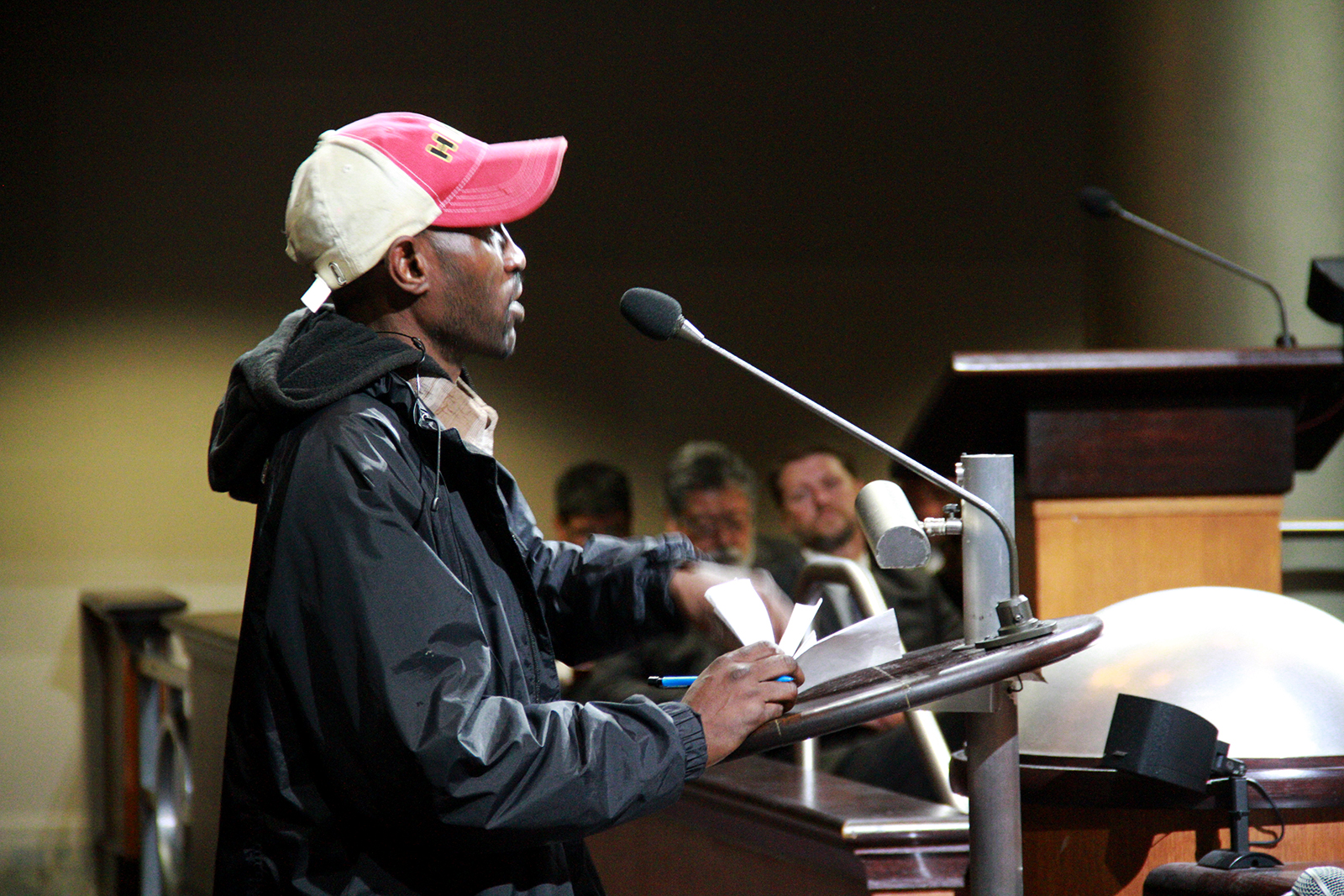 - Oakland resident spoke against city’s demolishing a self-organized homeless encampment at Tuesday night’s meeting. Photo by Tian Chenwei.