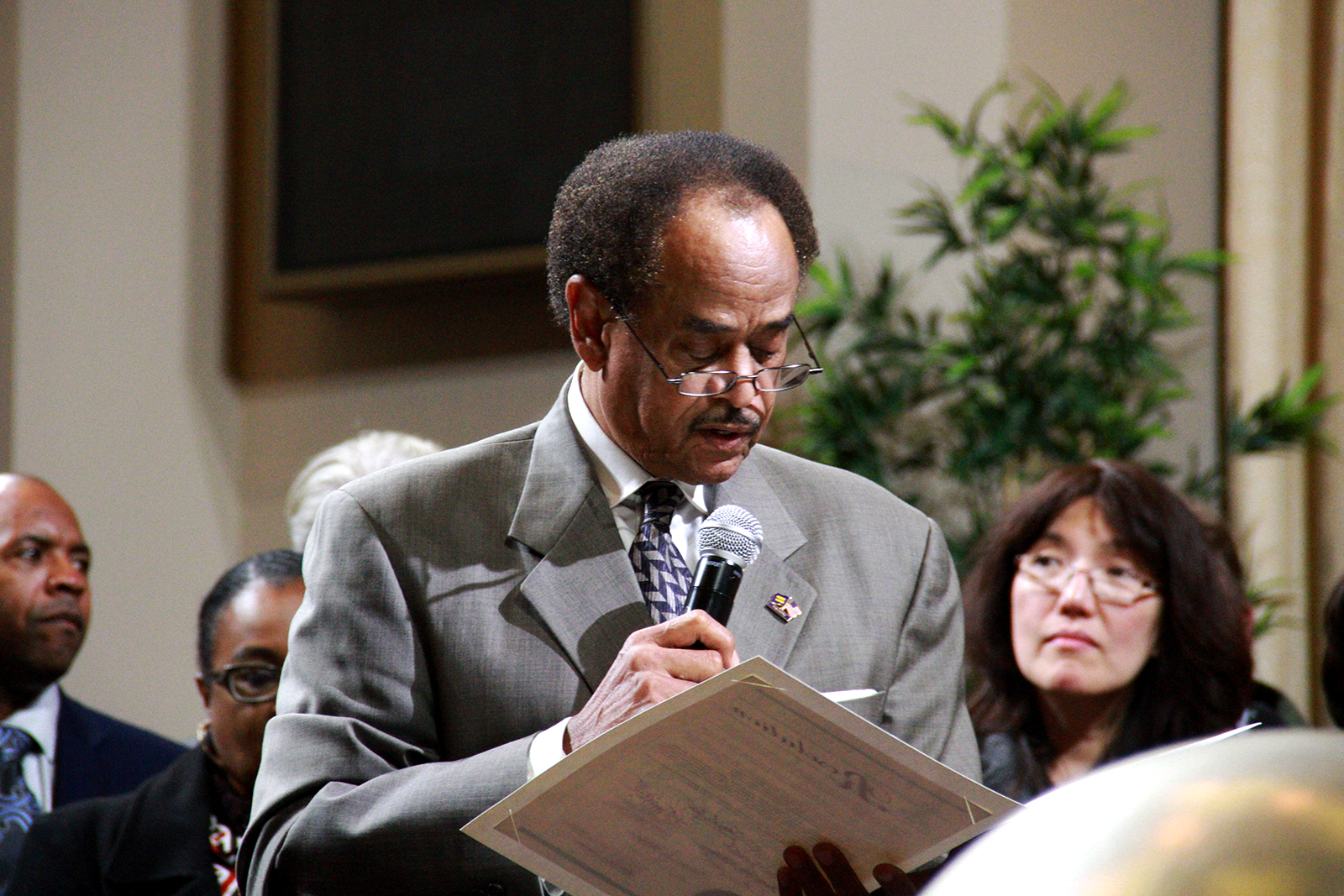 - Council President Larry Reid (District 7) presented the resolution honoring Brooke A. Levin for her 26 years of service in Oakland. Photo by Tian Chenwei.