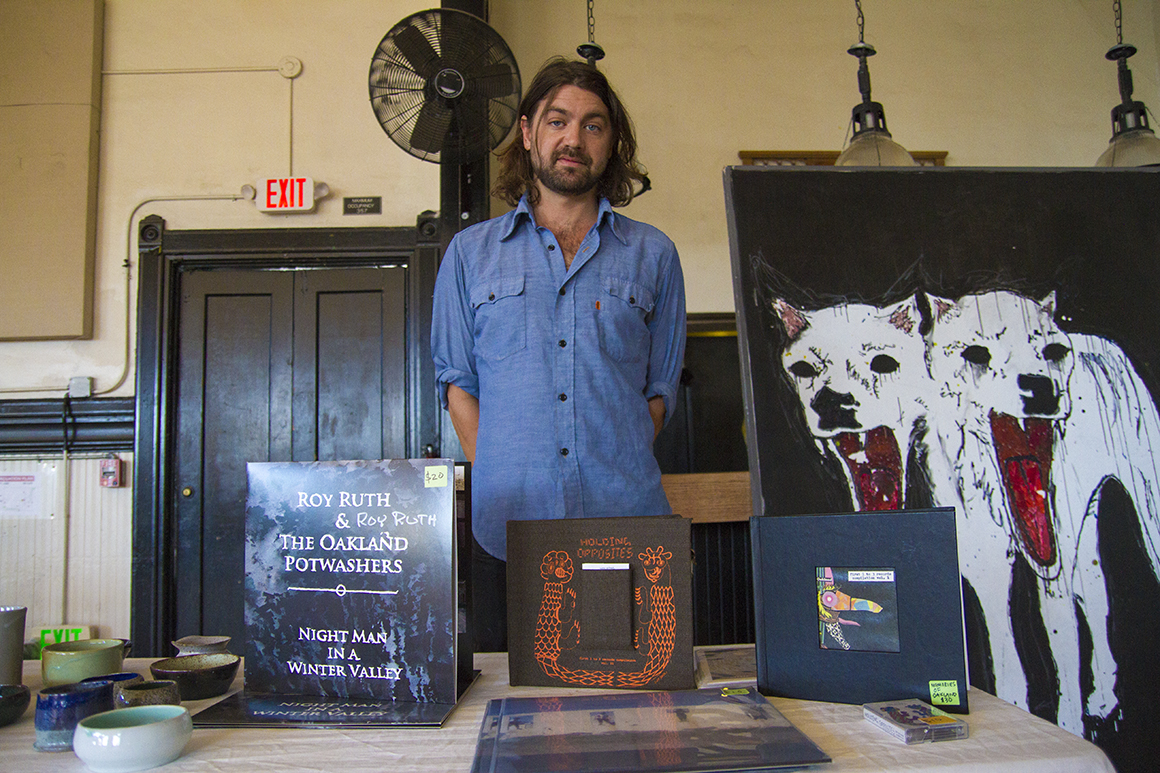 - Winston Goertz-Giffen, co-founder of the Oakland Family Fund, which helps those affected by the Ghost Ship fire, poses with his wares. The art sale was set up to assist those affected by the fire, as well as the Oakland Warehouse Coalition and the nonprofit organization Land Action. Photo by Abner Hauge.
