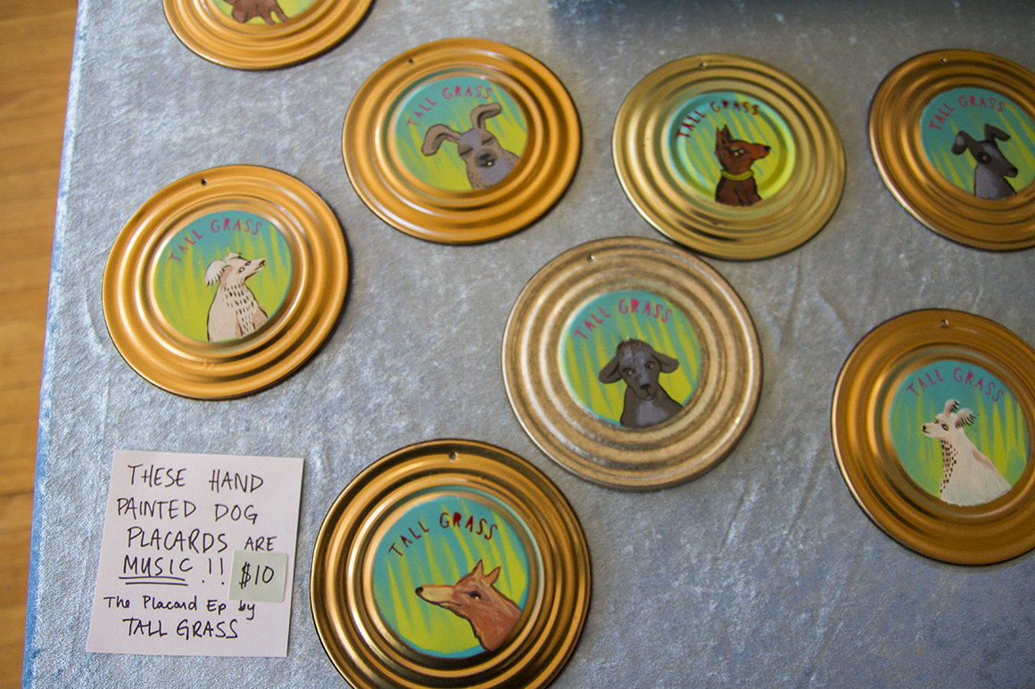 - Plaques depicting dogs in the grass hand-painted by Rosie Steffy with download codes on the back for an album by her 2-piece band Tall Grass with fellow artist Andrew Macy. Photo by Abner Hauge.