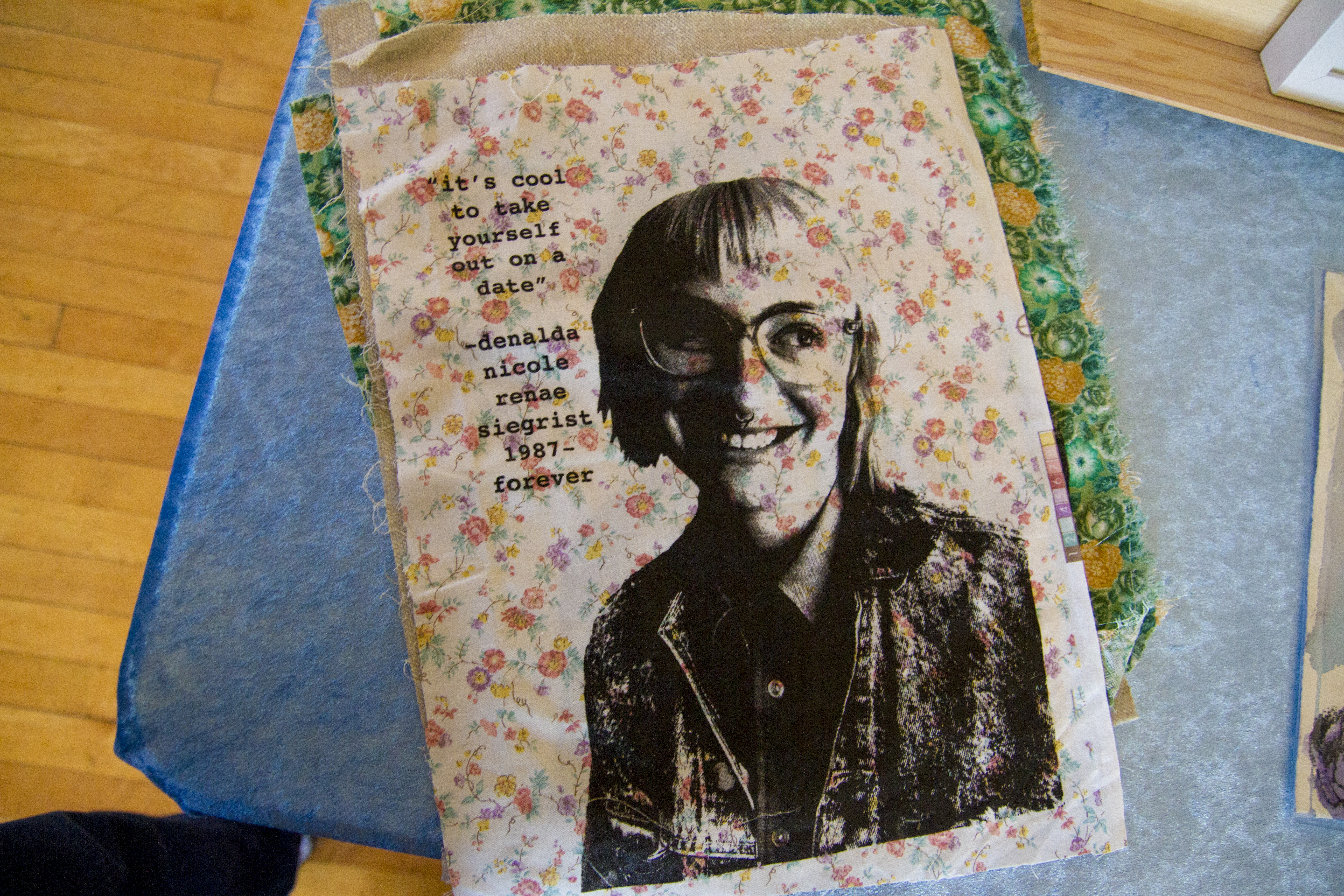 Among the artwork being sold were back patches–pieces of cloth with images silk-screened on them intended to be sewn onto the back of shirts or jackets–depicting Denalda Nicole Siegrist, one of the 36 people who perished in the fire. The patches were designed and crafted by artists Jordan Baxter-Stern and Zoë Ceja.