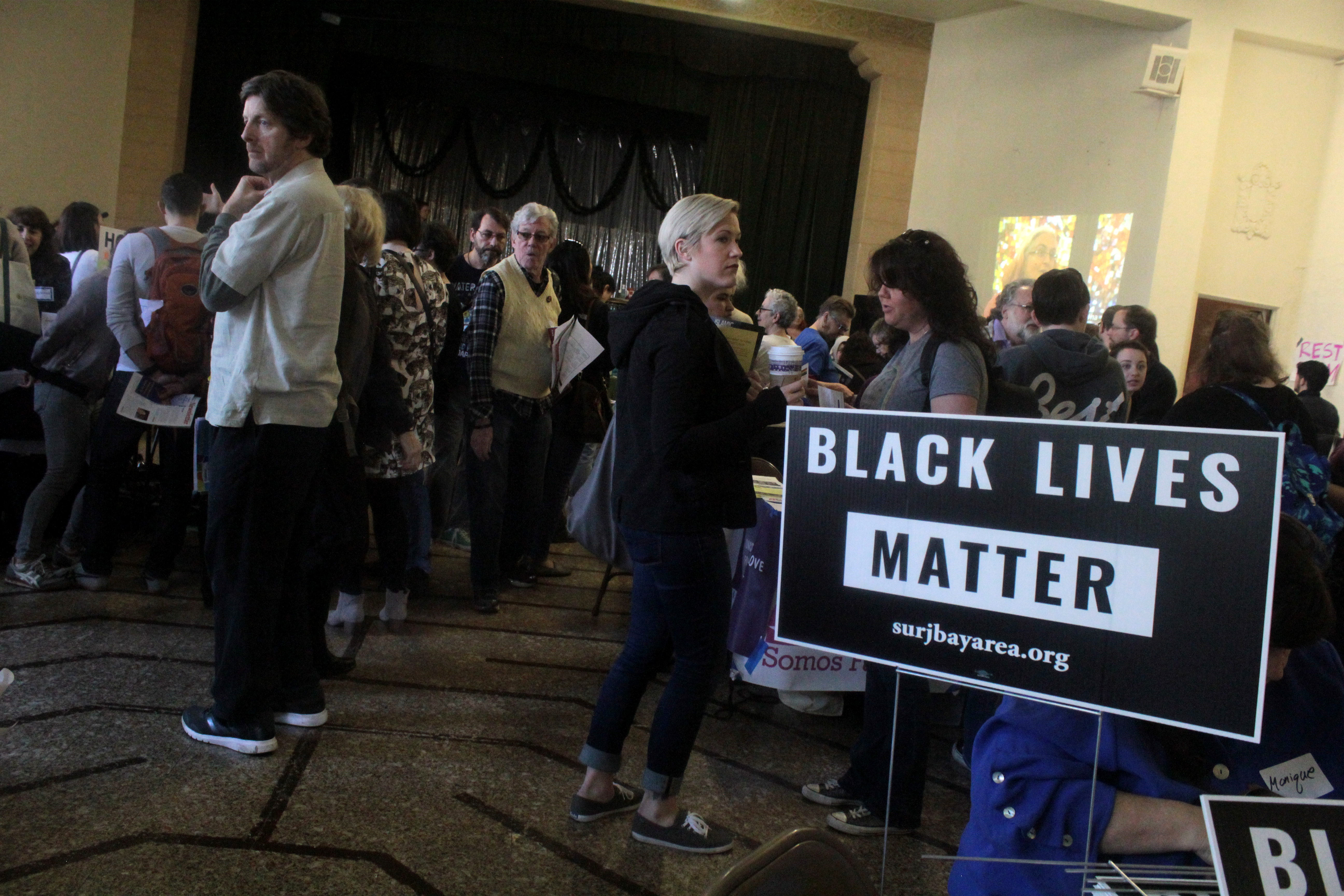 Members of organizations such as the American Civil Liberties Union (ACLU); Speak Out Now, an East Bay revolutionary socialist group; the Oakland Public Library; Showing Up for Racial Justice (SURJ), a national network organizing white people for racial justice; and Narika set up information tables to speak to attendees about registering as volunteers, signing petitions, or how to donate or get involved in local activism.