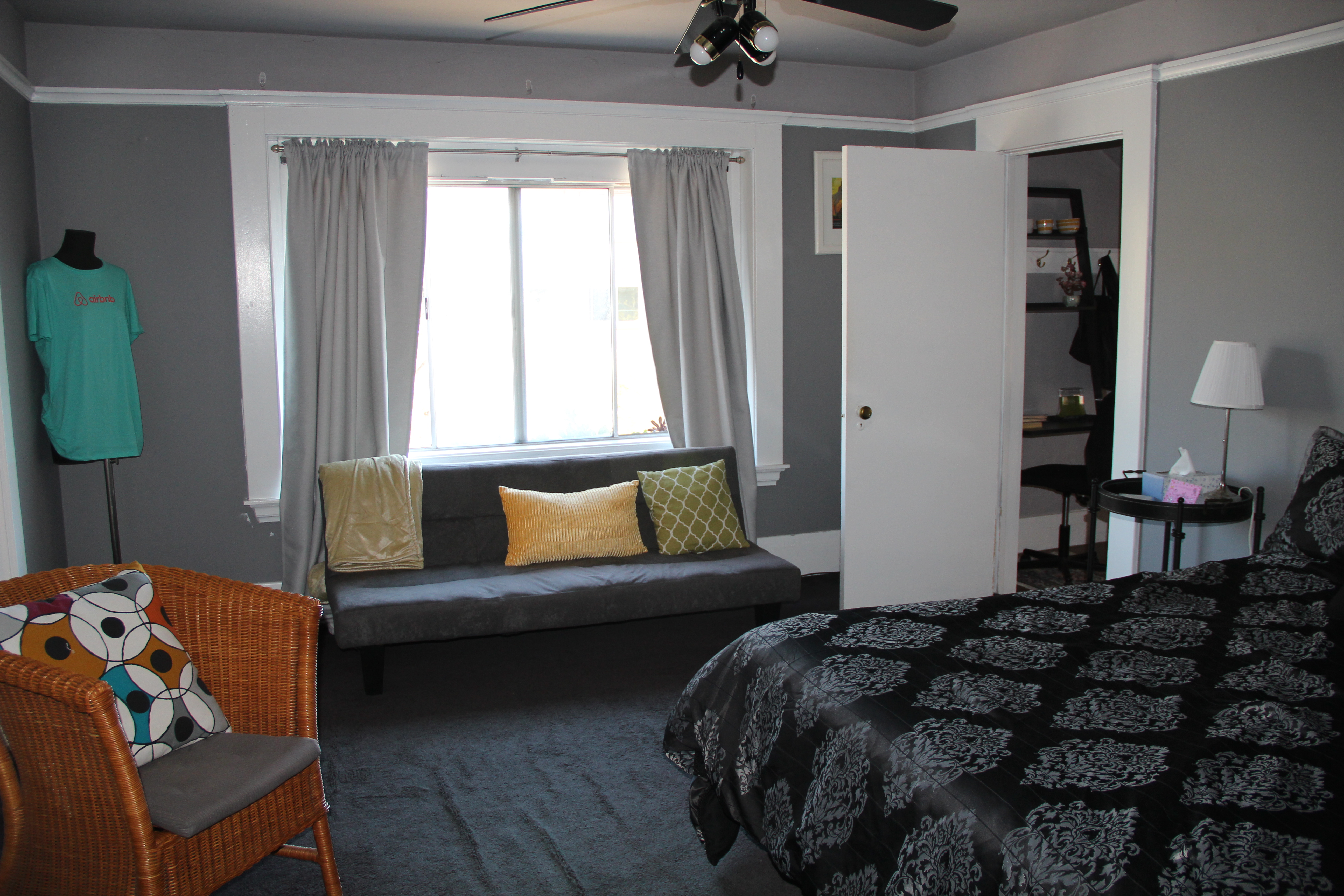 Her house, a three-story Craftsman style home, is three blocks from Perch Coffee House and just a couple more blocks away from the lake itself. Guests have full access to Mackey’s kitchen, backyard, washer and dryer, and living and dining rooms. The room features a queen size bed, futon, walk-in closet, and alcove with a desk and additional space for luggage.