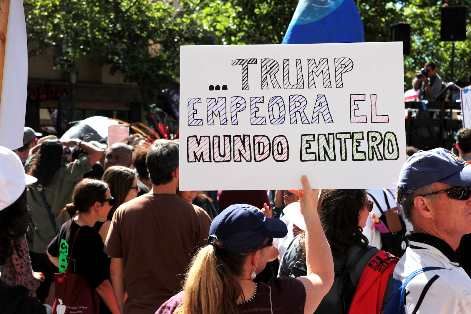 - A demonstrator at the May Day march in Fruitvale holds a sign reading “Trump makes the whole world worse.” Photo by Andrew Beale.