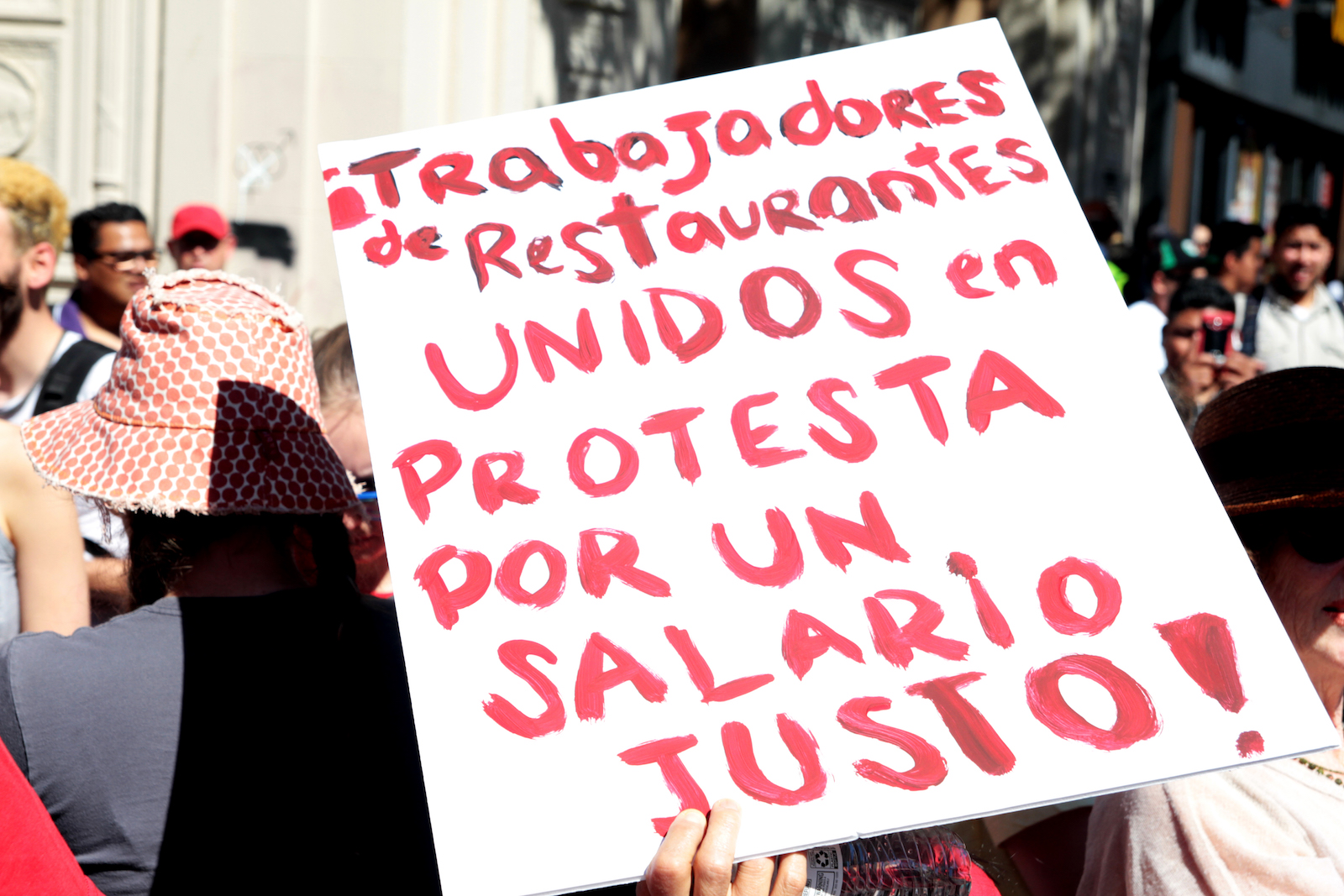- A demonstrator holds a sign that reads “Restaurant workers united in protest for a fair wage.” Restaurant Opportunities Center United, an Oakland-based organization, led a restaurant-worker strike for May Day. Photo by Andrew Beale.