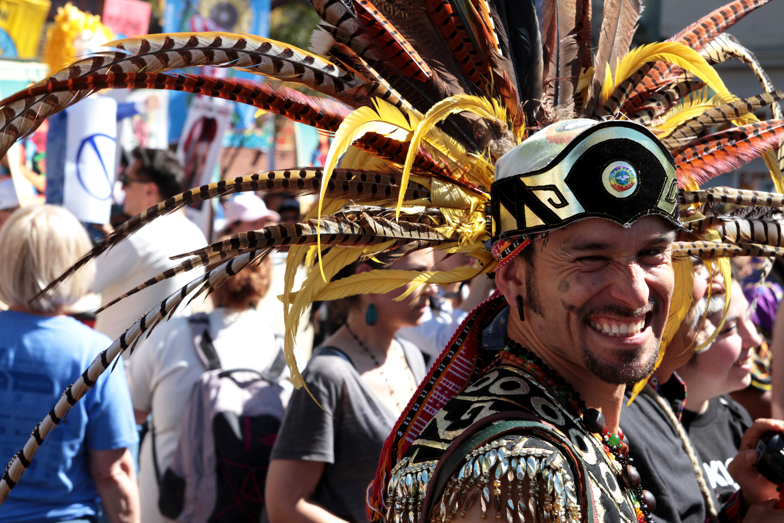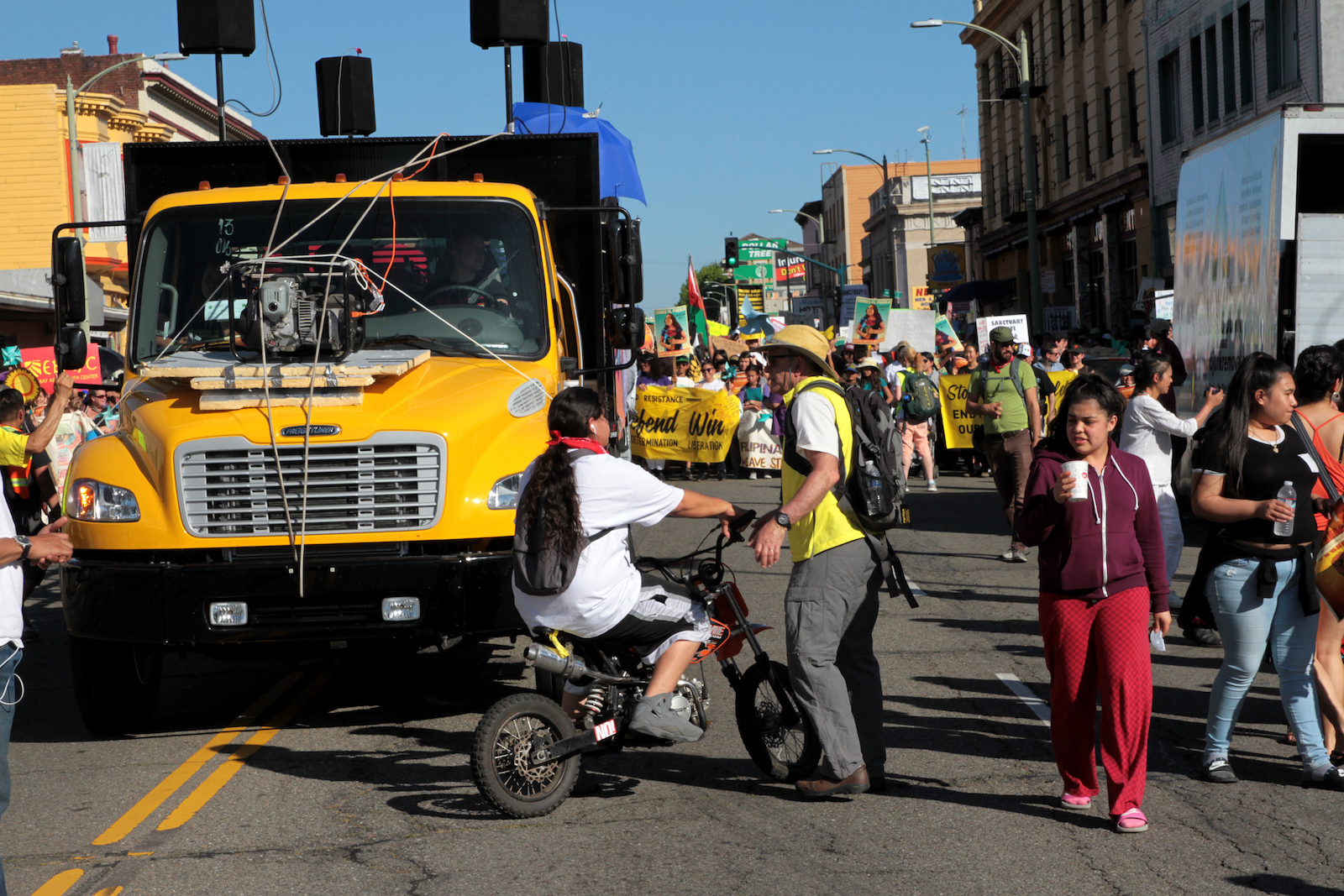 They passed the Native American Health Center near 31st Avenue and the cool breeze carried the scent of indigenous dancers’ burning sage across the crowd. The huge flatbed truck carrying a PA system and a dozen people leading chants stopped so the stragglers could catch up.