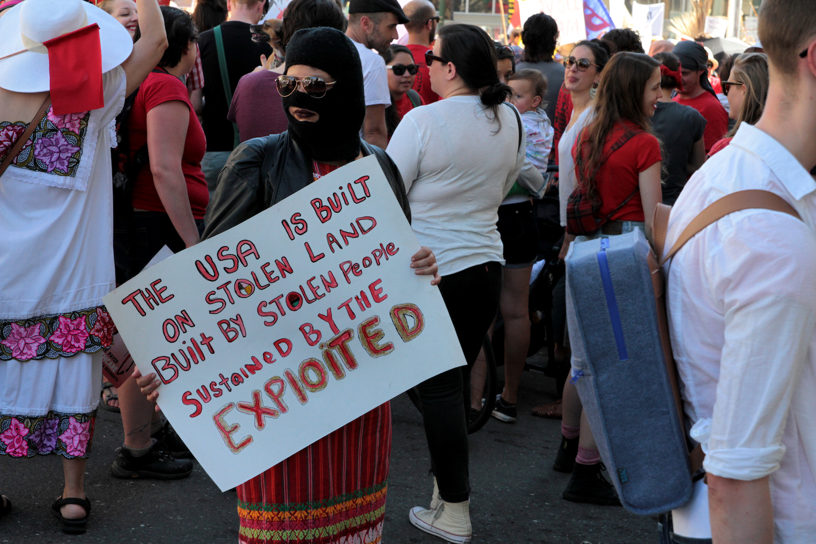 - A demonstrator at the May Day march holds a sign reading “The USA is built on stolen land, built by stolen people, sustained by the exploited.” Photo by Andrew Beale.