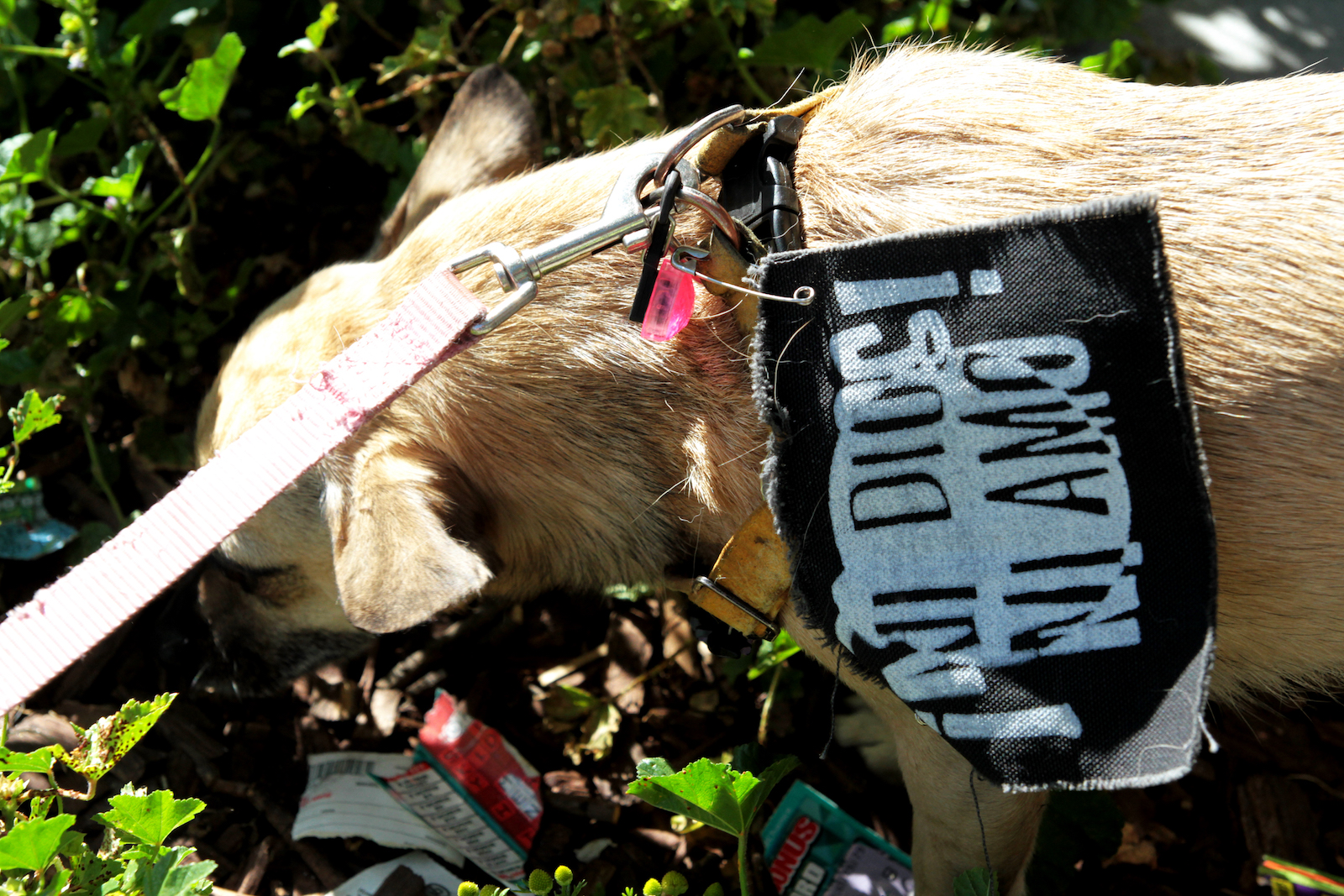 - A demonstrator’s dog wears a sign reading “No Gods, No Masters,” a late-19th-century anarchist slogan. Photo by Andrew Beale.