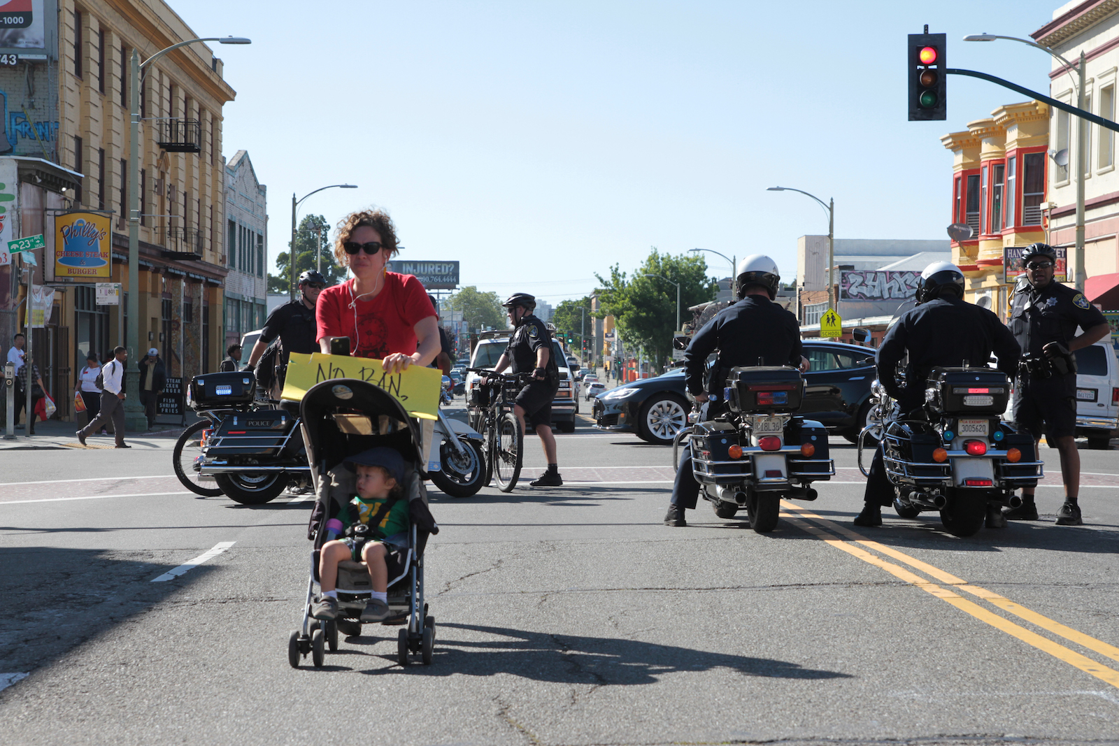 - A woman pushes a stroller through a line of police officers on motorcycles to reach the May Day march. Photo by Andrew Beale.