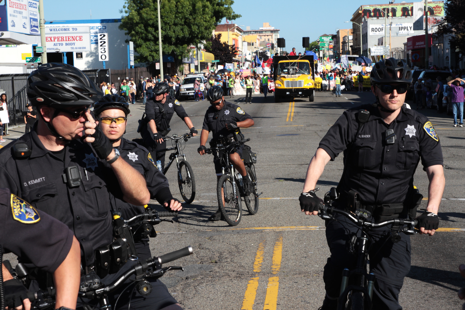 The Oakland Police Department reported that there were no arrests or incidents of violence at the march. But as part of a separate May Day demonstration, four protesters were arrested attempting to block people from entering the Alameda County Administration Building at 1221 Oak Street downtown.