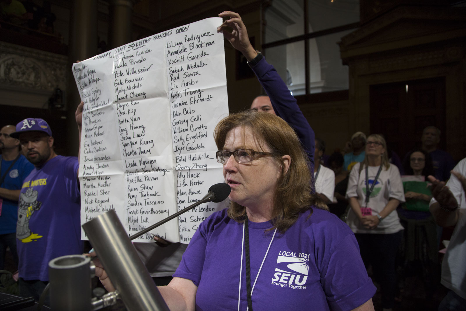 “We are so fed up,” said Alice McCain, an Oakland public librarian and homeowner who is also on the bargaining team with SEIU 1021. She held up a handwritten sign listing names of librarians who she said “wanted to be here tonight, but they couldn’t come because they’re keeping the libraries open until 8 pm tonight.”