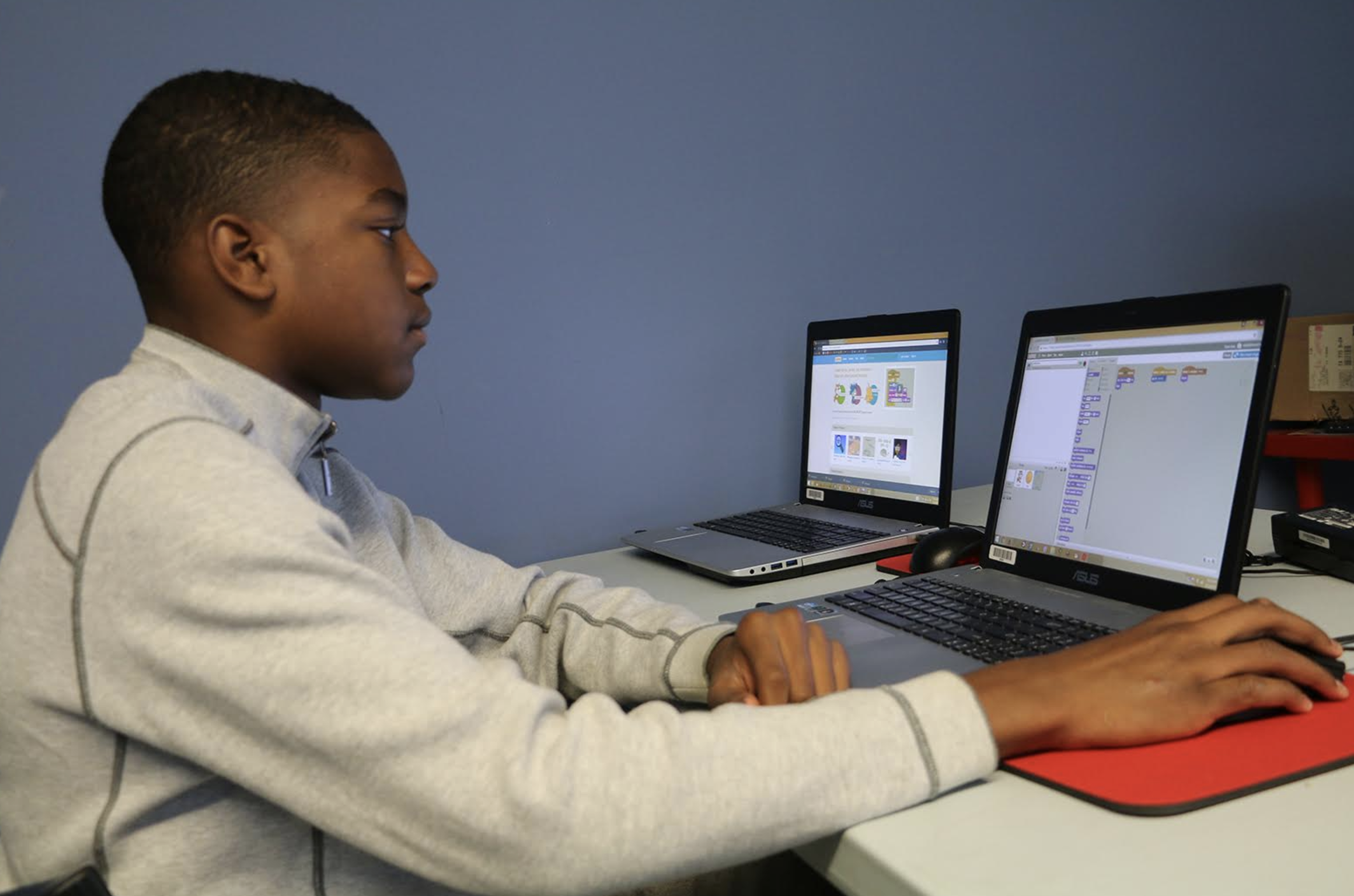 Akin Irvin, age 12, has attended the classes frequently over the last few weeks. Irvin’s mother found the class and decided to sign her son up because she knew he enjoyed playing video games. Irvin now has a growing passion for learning the language of coding.