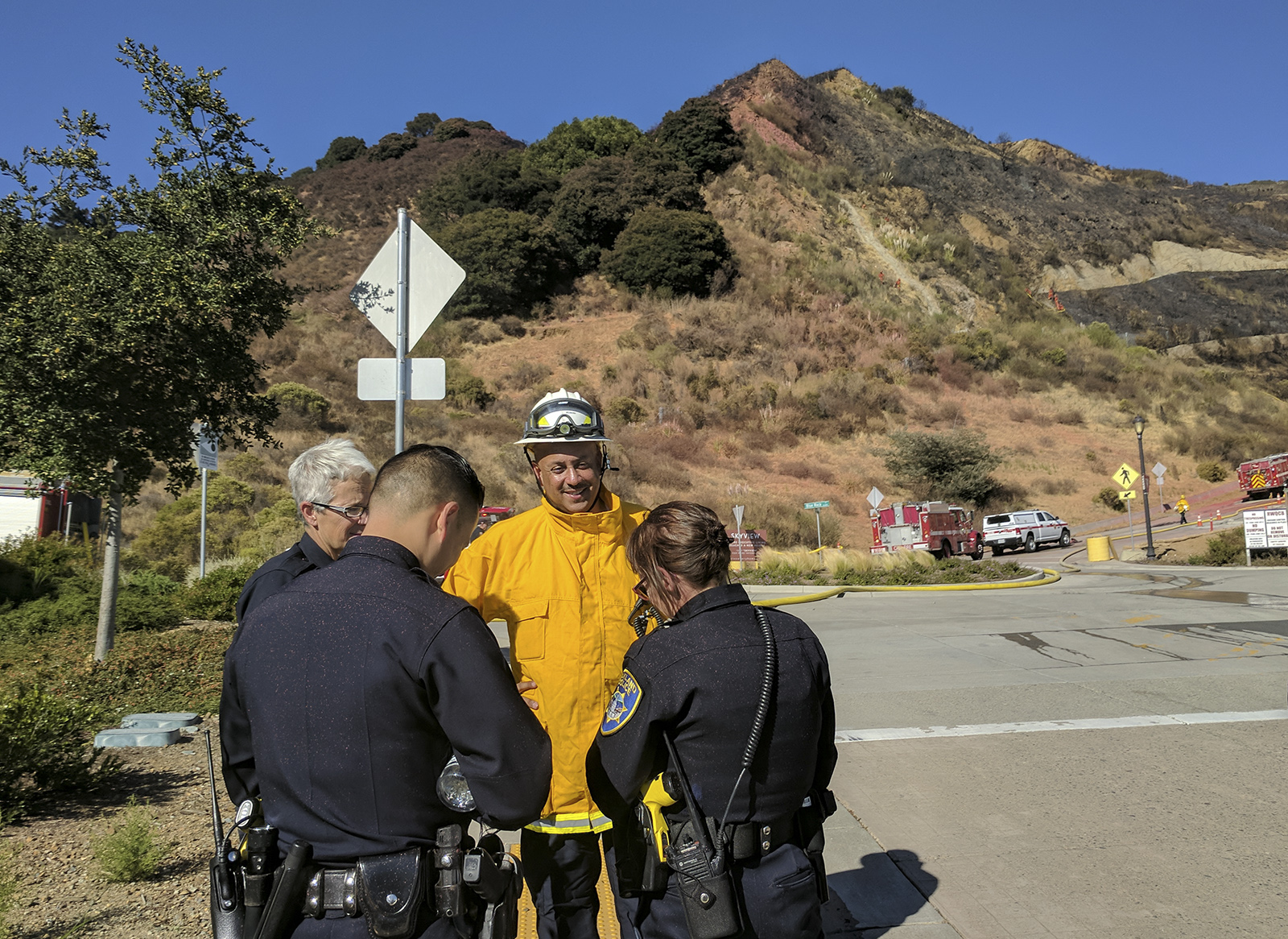 - Oakland Fire Department Interim Fire Chief Darin White and Media Relations Officer Johnna Watson at the scene of a four-alarm fire in the Oakland hills on Tuesday. Photo by Drew Costley.