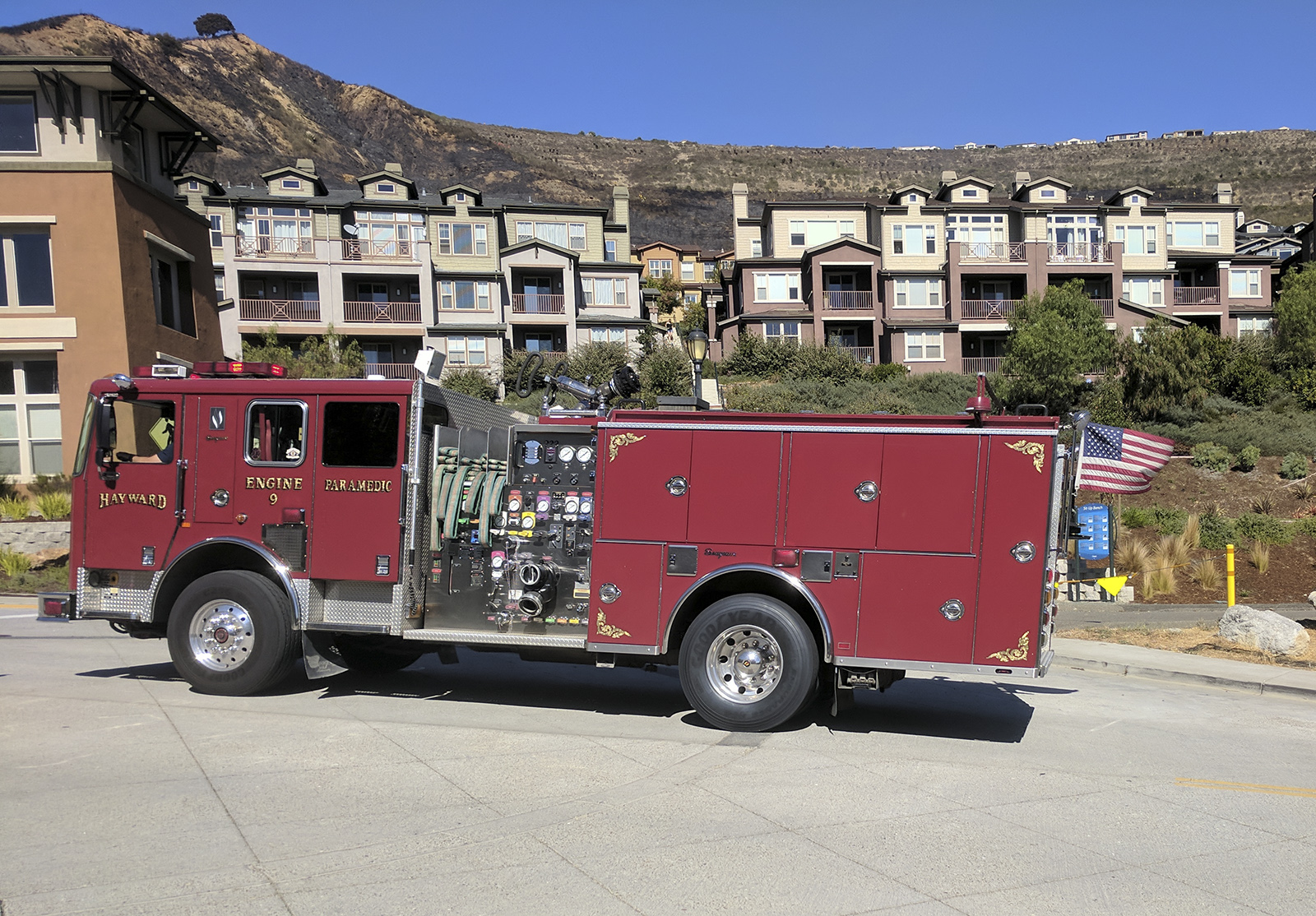 - A fire truck drives up the hills of the Monte Villas development in the Oakland hills. Photo by Drew Costley.