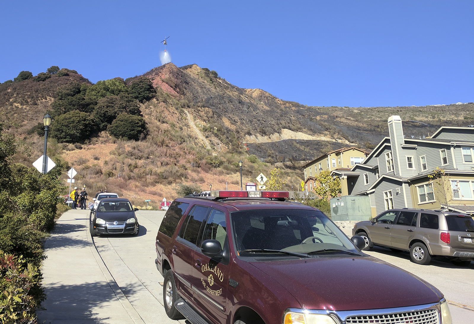 - A Cal Fire helicopter drops water on a four-alarm fire in the Oakland hills on Tuesday. Oakland Fire Department Interim Chief Darin White said that there is a 100 percent perimeter around the fire. Photo by Drew Costley.