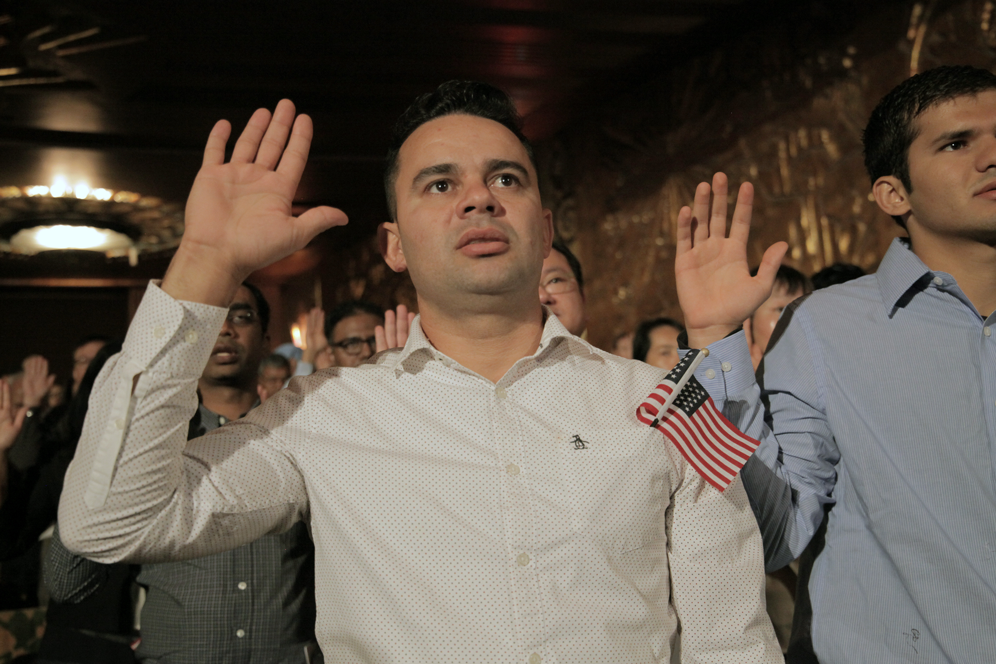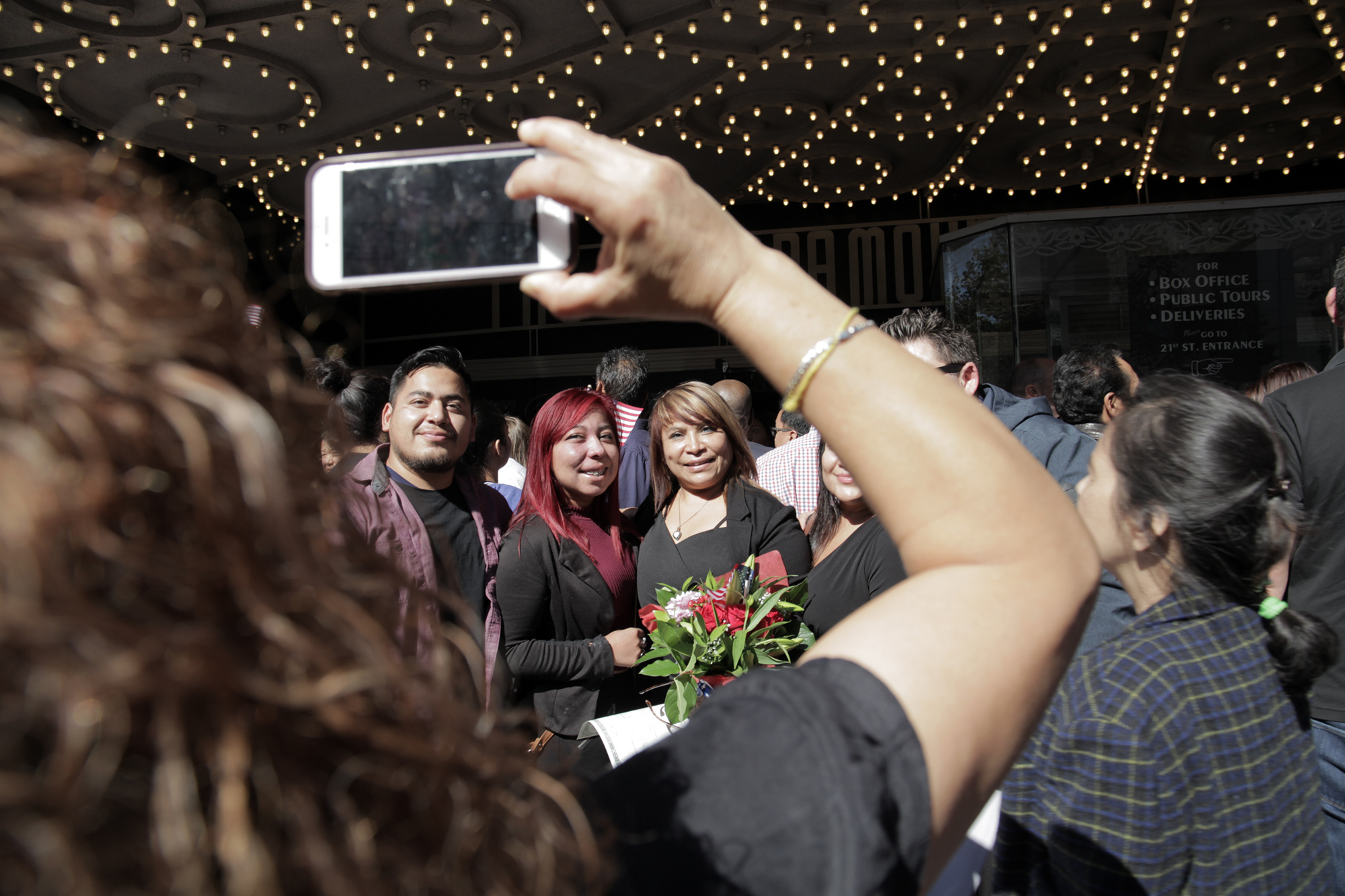 “Are you naturalizing today?” an usher in a bejeweled American flag baseball cap asked guests as they arrived. “Straight ahead! The ceremony is in here.” A man rushed into the theatre holding a bouquet of flowers wrapped in American-flag tissue paper. Inside, people who were about to be naturalized presented their Green Cards and appointment notices before being ushered through to the main floor. Spanish, Tagalog, Punjabi, Mandarin and dozens of other languages filled the crowded lobby as families and friends chatted on their way up to the balcony.