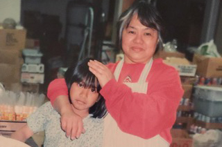 - Nina Castro Cruz, age nine, with her mother, Adelaida Castro, summer 1993. “I worked in the stockroom packaging our bulk item products,” Castro Cruz says.