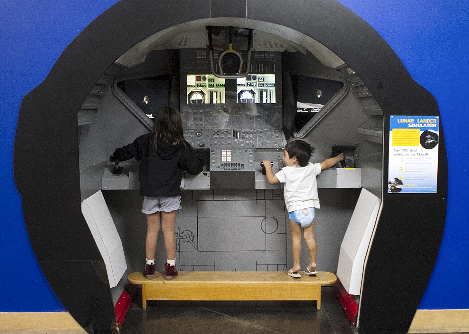 - Siblings Valentina cornejo, 6, and her brother Aeneas Cornejo, 2, attempt a moon landing in a flight simulator at the Chabot Space and Science Center.