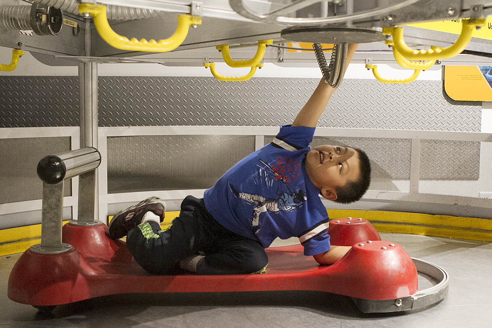 - Andy Li, 5, plays in a space station tool simulation at the Beyond Blastoff exhibit at Chabot Space and Science Center.