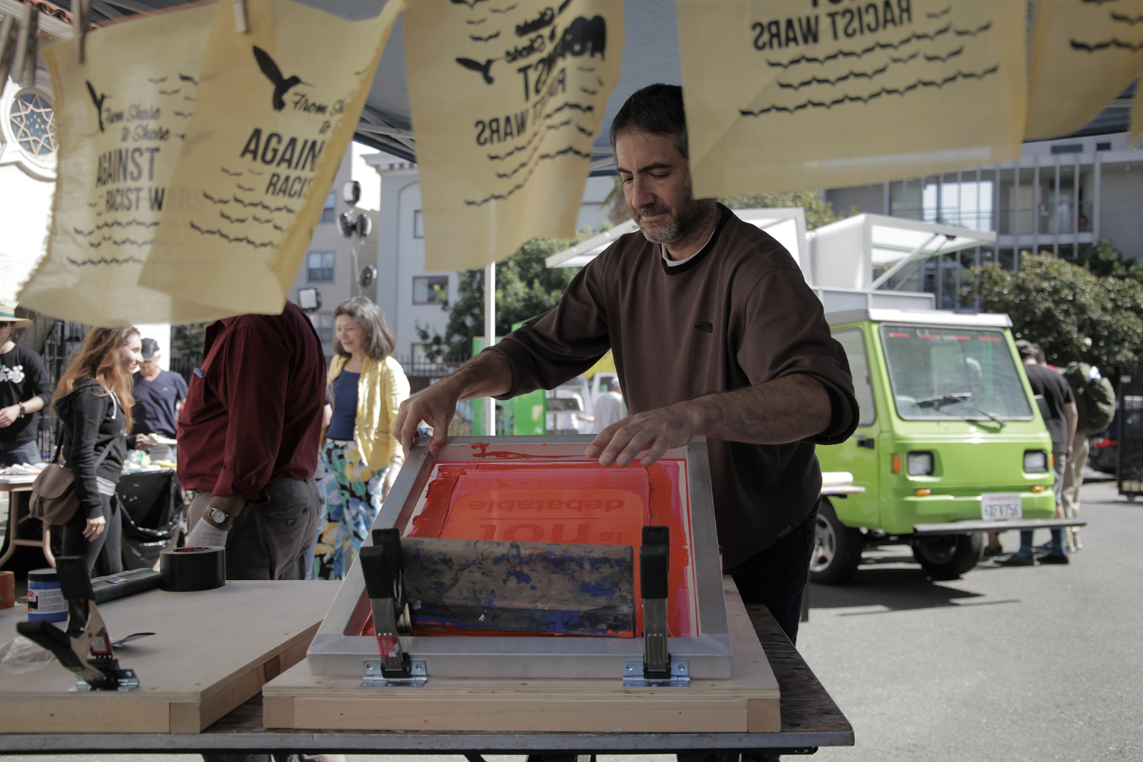 - Sami Kitmitto, a member of the Arab Resource and Organizing Center, helps with screen printing. “This is part of our work to oppose racism in the U.S.,” Kitmitto said. Photo by Caron Creighton