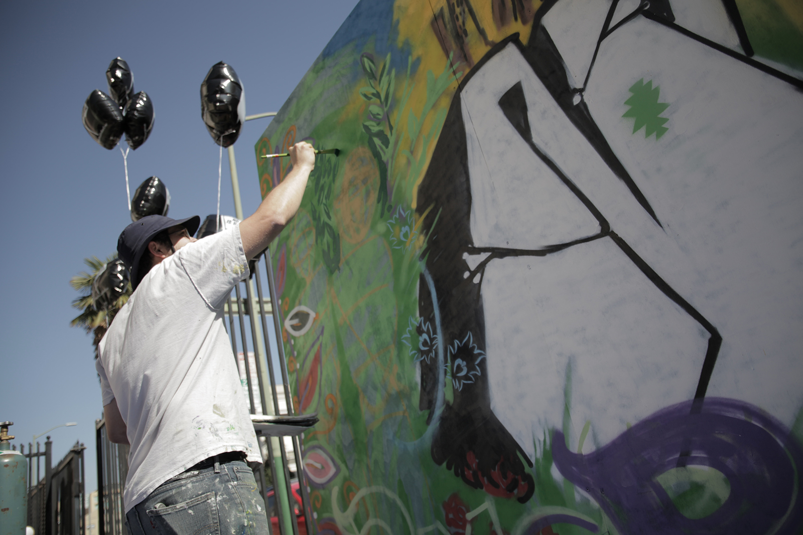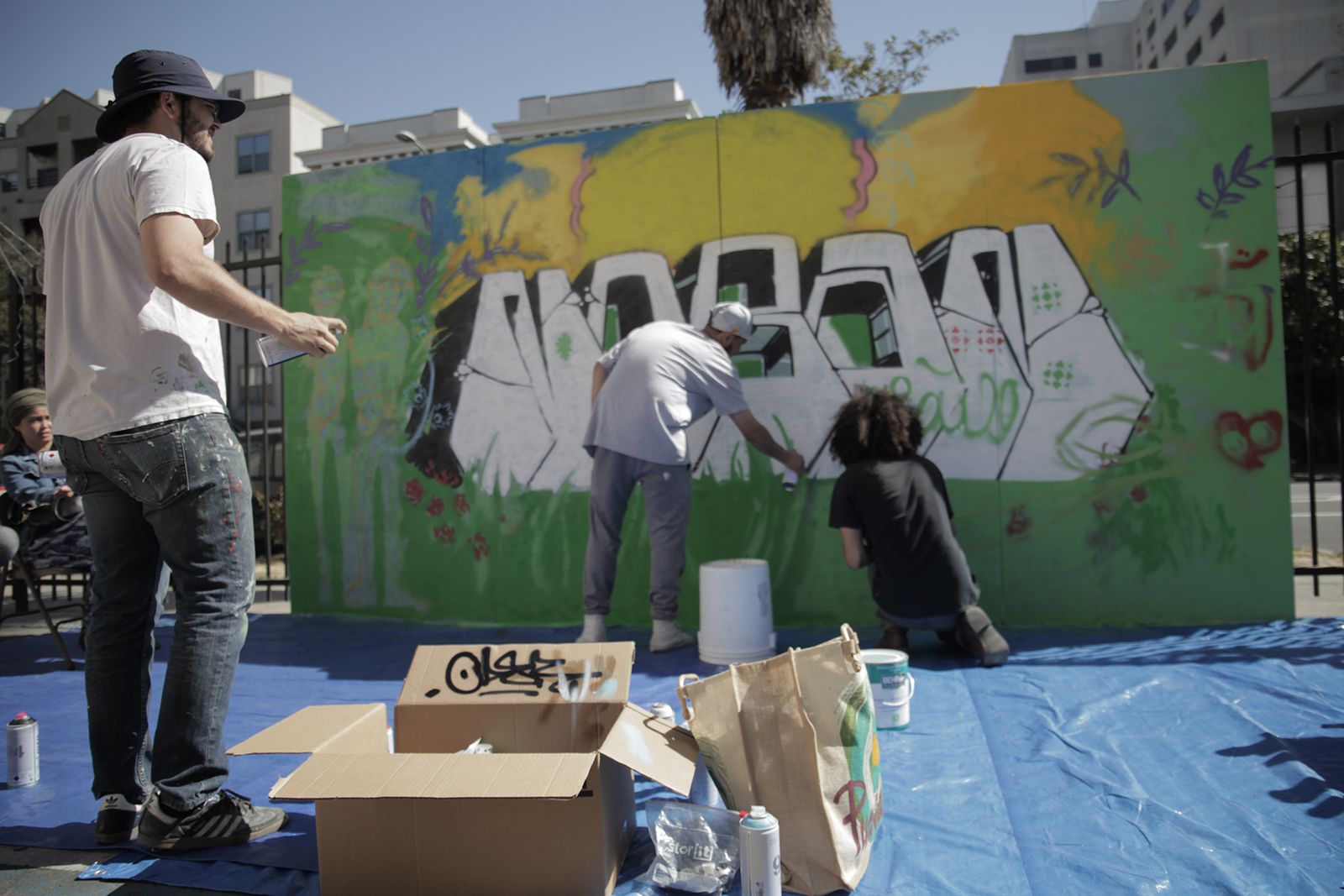 - Ryan Kelder (left), Gabril Garay (center) and Keyvan Shovir (right) contribute to a mural during the Creative Resistance event at the Islamic Cultural Center of Northern California on Sunday. Photo by Caron Creighton