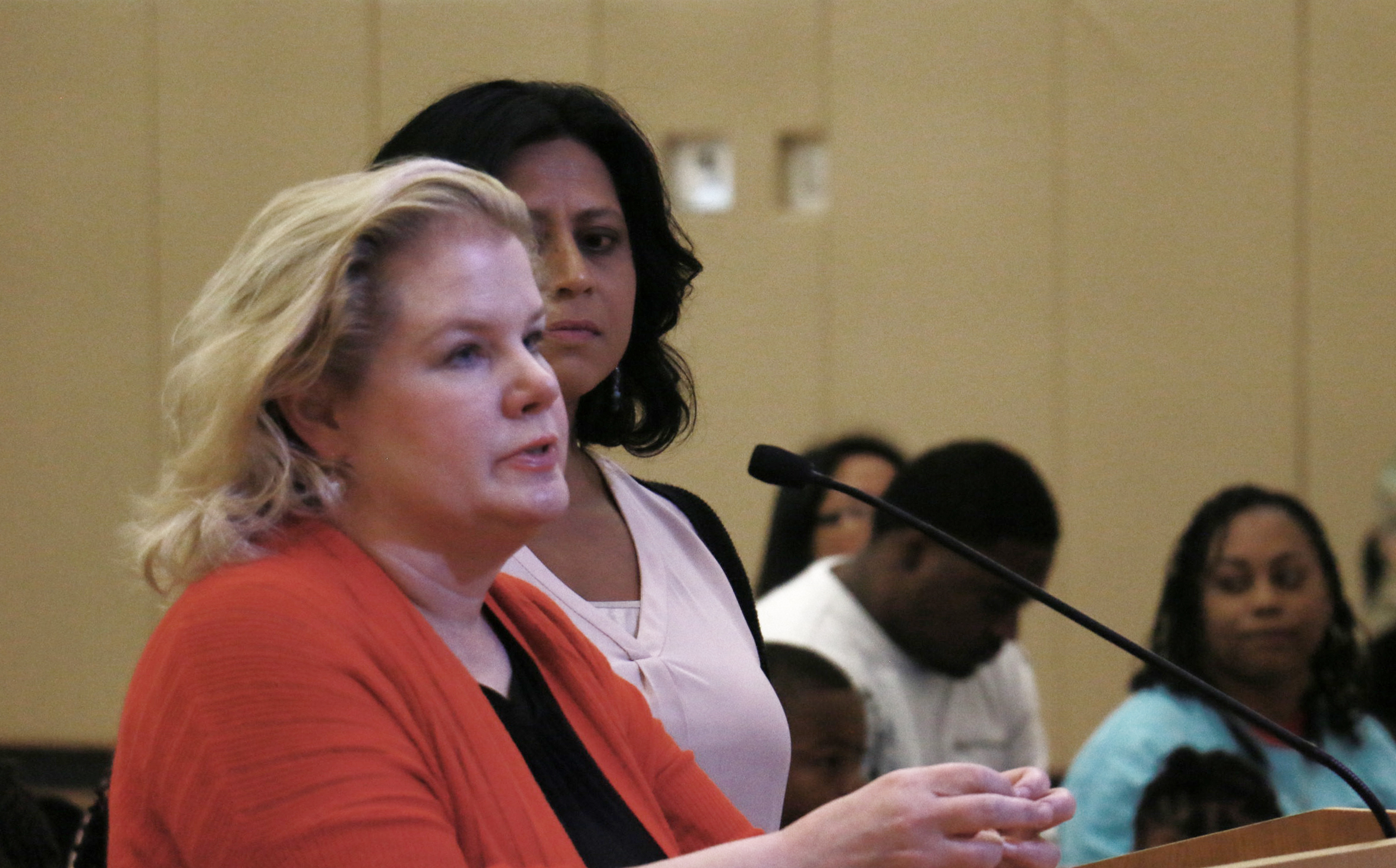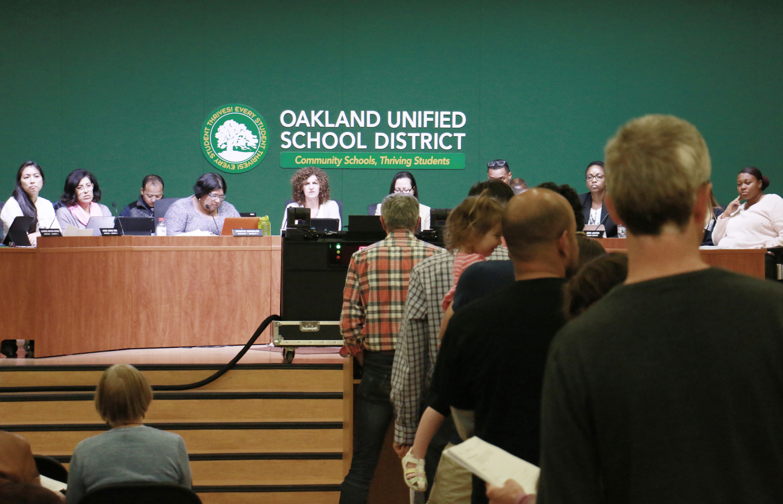 - Community members file to the podium to voice concerns to the OUSD school board. Photo by Hyowon Lihinag-Tam.