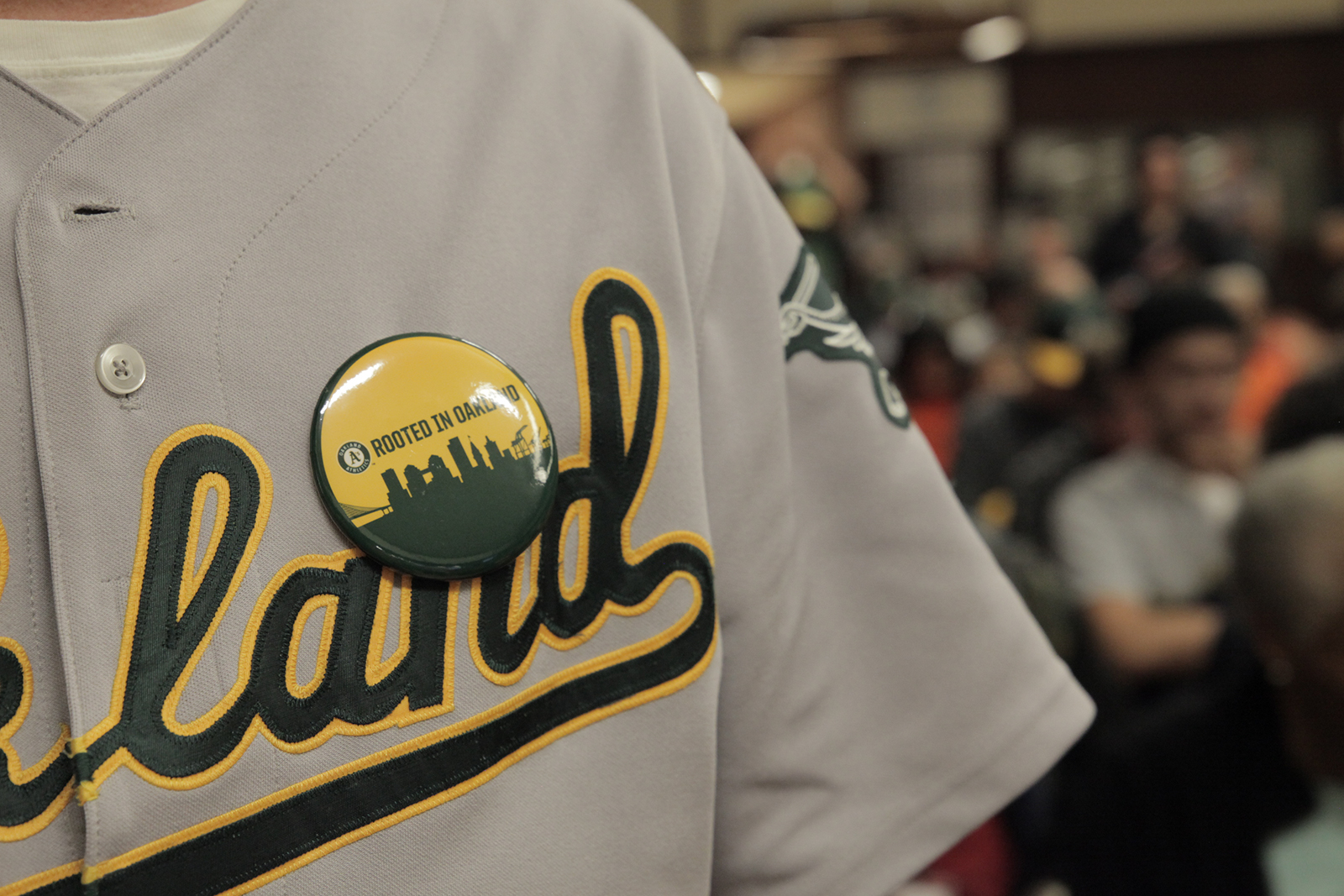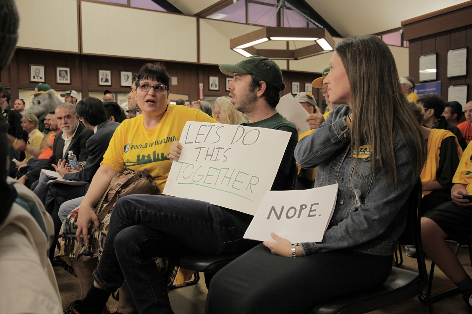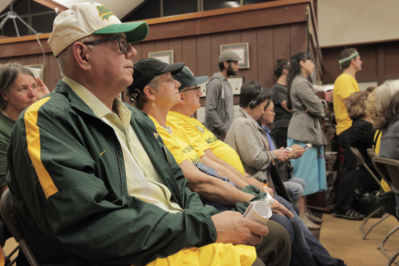 A large portion of the crowd was comprised of A’s fans in matching yellow t-shirts that read “Rooted in Oakland.” “I think a lot of people falsely believe this is a sports versus city argument,” said Jacob Russell-Snyder, who backs the plan for the new stadium. “We want this stadium not because we want a better sports team, but because we want Oakland to be represented around the world.”