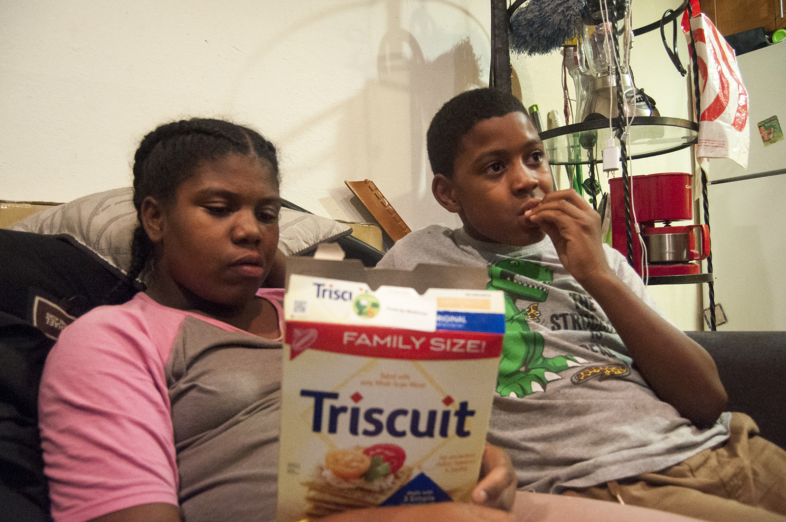 While waiting for dinner to be ready, Davonne and Armajah start munching on Triscuits, their new favorite snack. Davonne said that they acquired a taste for them through participating in the study.