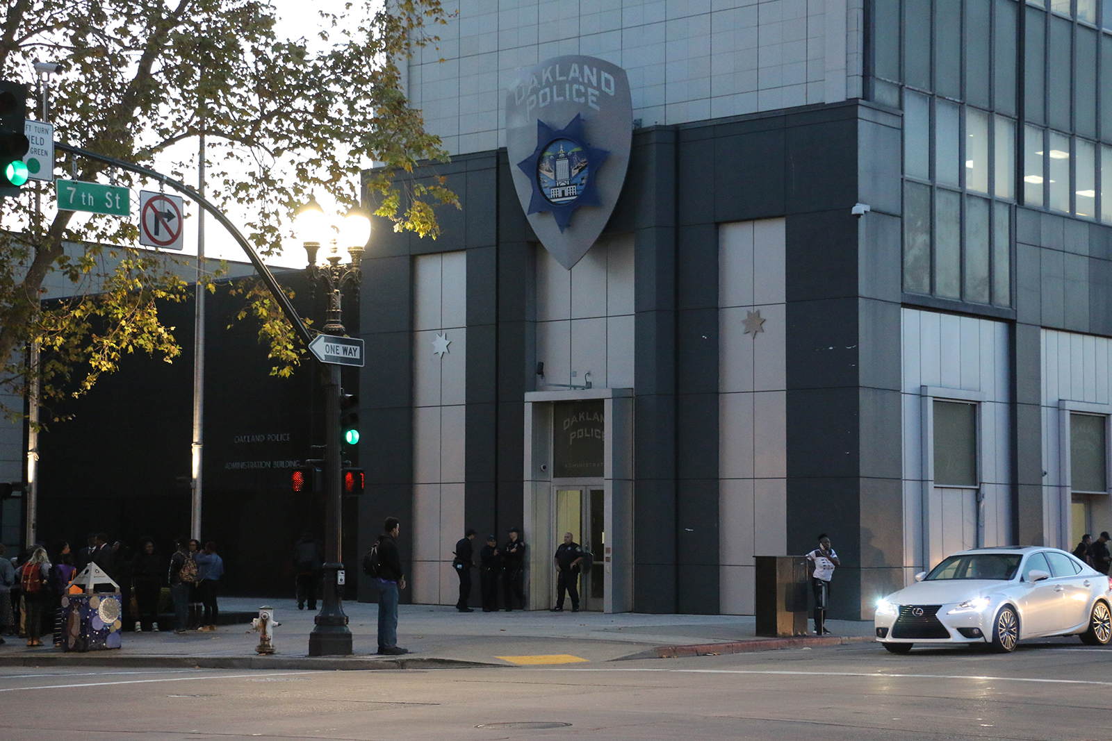 The rally had been scheduled to run from 5 pm to 7 pm, and as of 4:45 pm there were at least five police officers at each of the Oakland police building’s main entrances. The five male officers at the front entrance seemed relaxed—texting or making phone calls, talking amongst themselves, and passing around a sleeve of cookies.