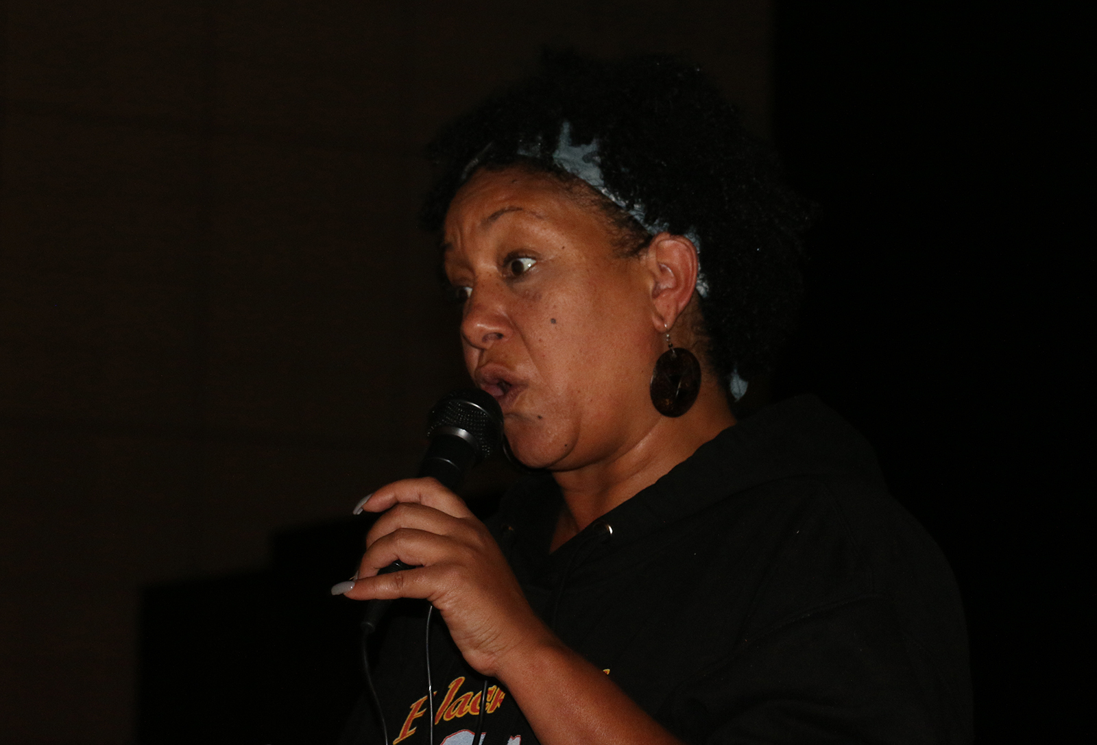 - Anti Police-Terror Project co-founder Cat Brooks speaks to those gathered, Tuesday.