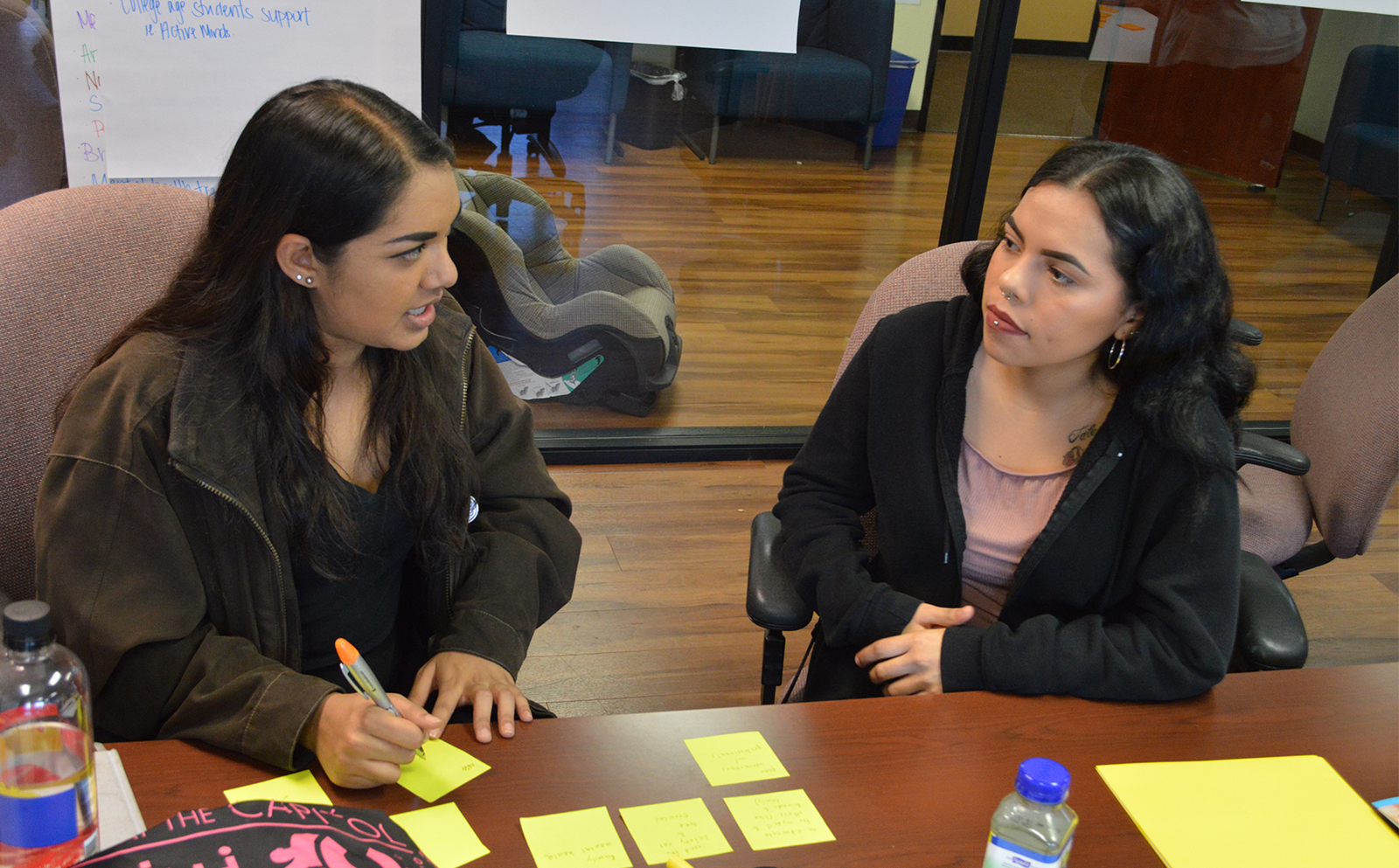 - Smitha Gundavajhala and Jennifer Trujillo, members of regional TAY groups, work on an activity at a TAY retreat at the PEERS headquarters in Oakland.