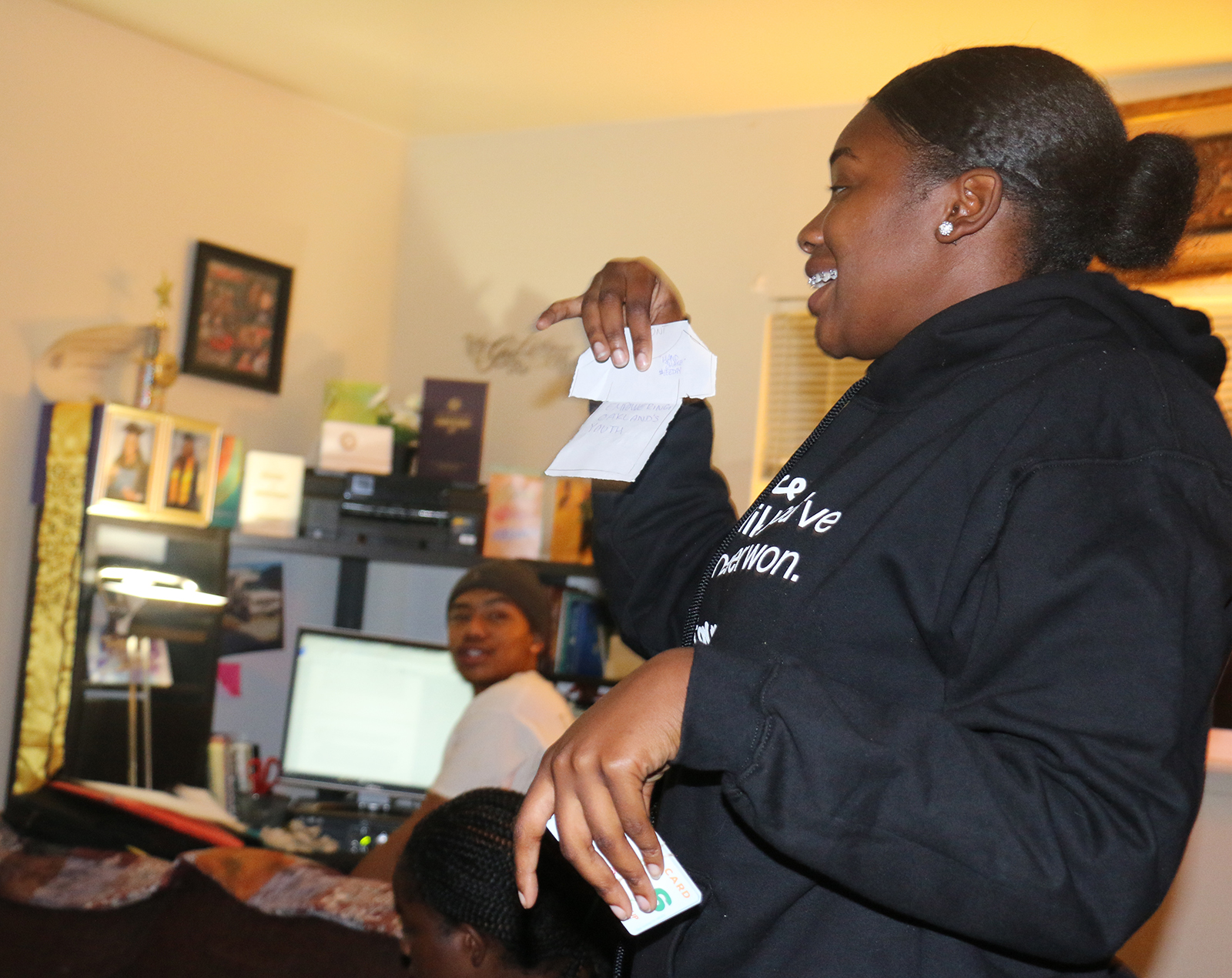Once Rodriguez arrives, they all gather in the living room and snack on the pizzas she has brought with her. They begin planning an event to discuss youth empowerment and gun violence in Oakland, with Rodriguez taking notes in her journal. They intend to invite Wanda Johnson, mother of Oscar Grant, the 22-year-old African American man who was shot by a BART police officer in 2009.