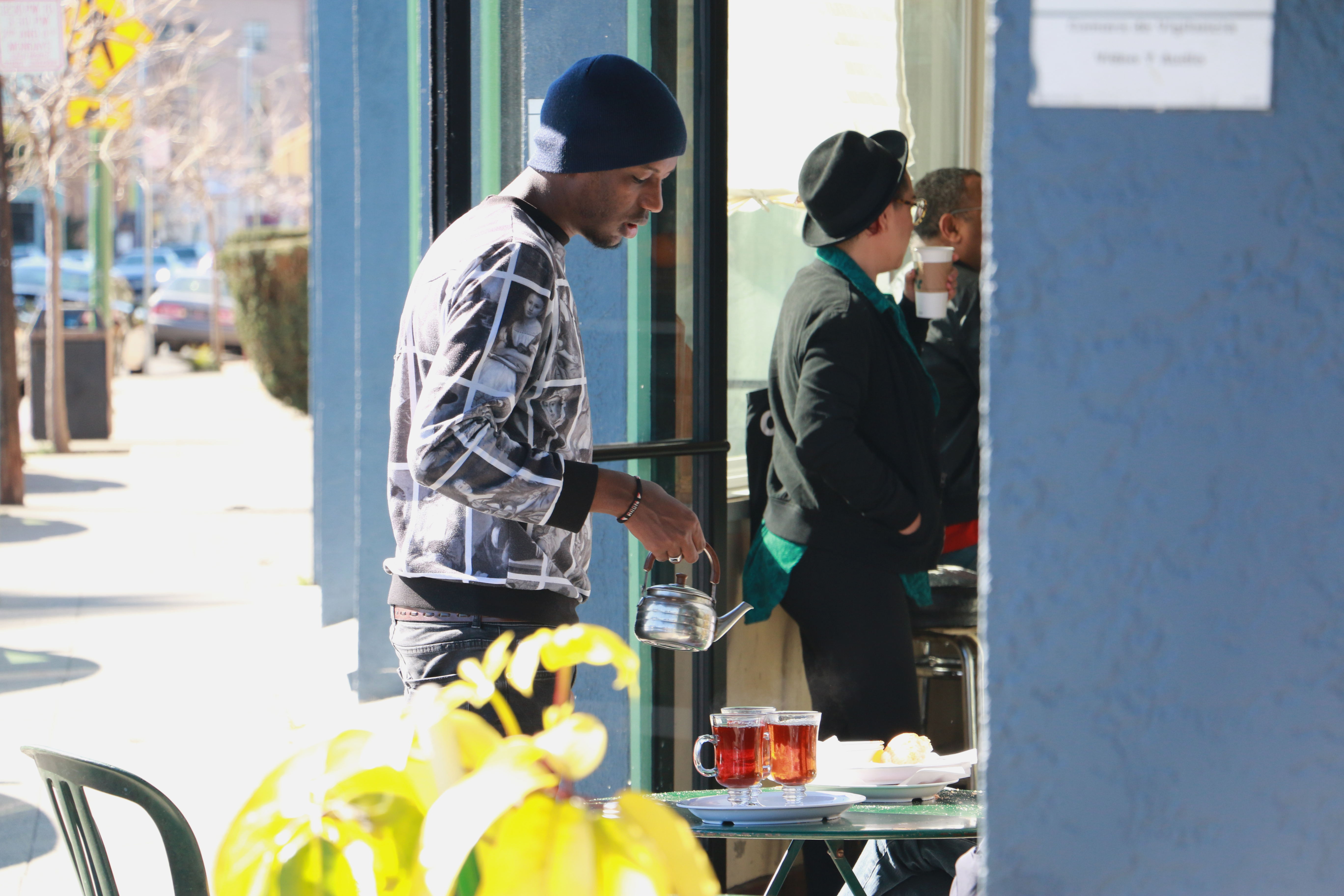 As they enjoy each other’s company, a tall, slim man walks behind them and looks over their shoulder at their work as if he is supervising them. He then sits behind the counter on a stool next to the window, facing the sun. He breathes in slowly as if he is absorbing the sun. The older women pass by him with three plates in her hands. She drops off one plate to the man and walks outside to the patio to deliver the other two.