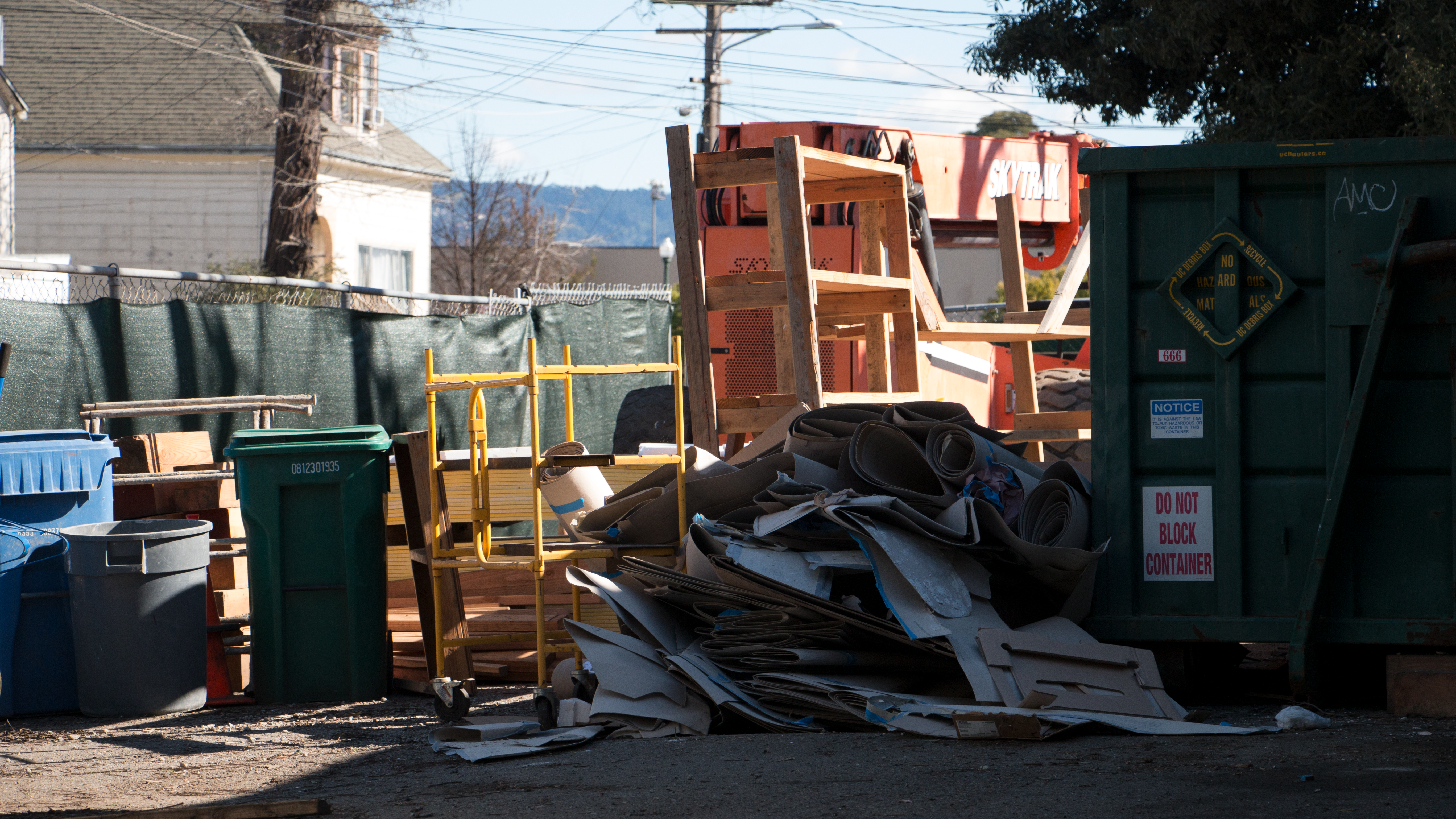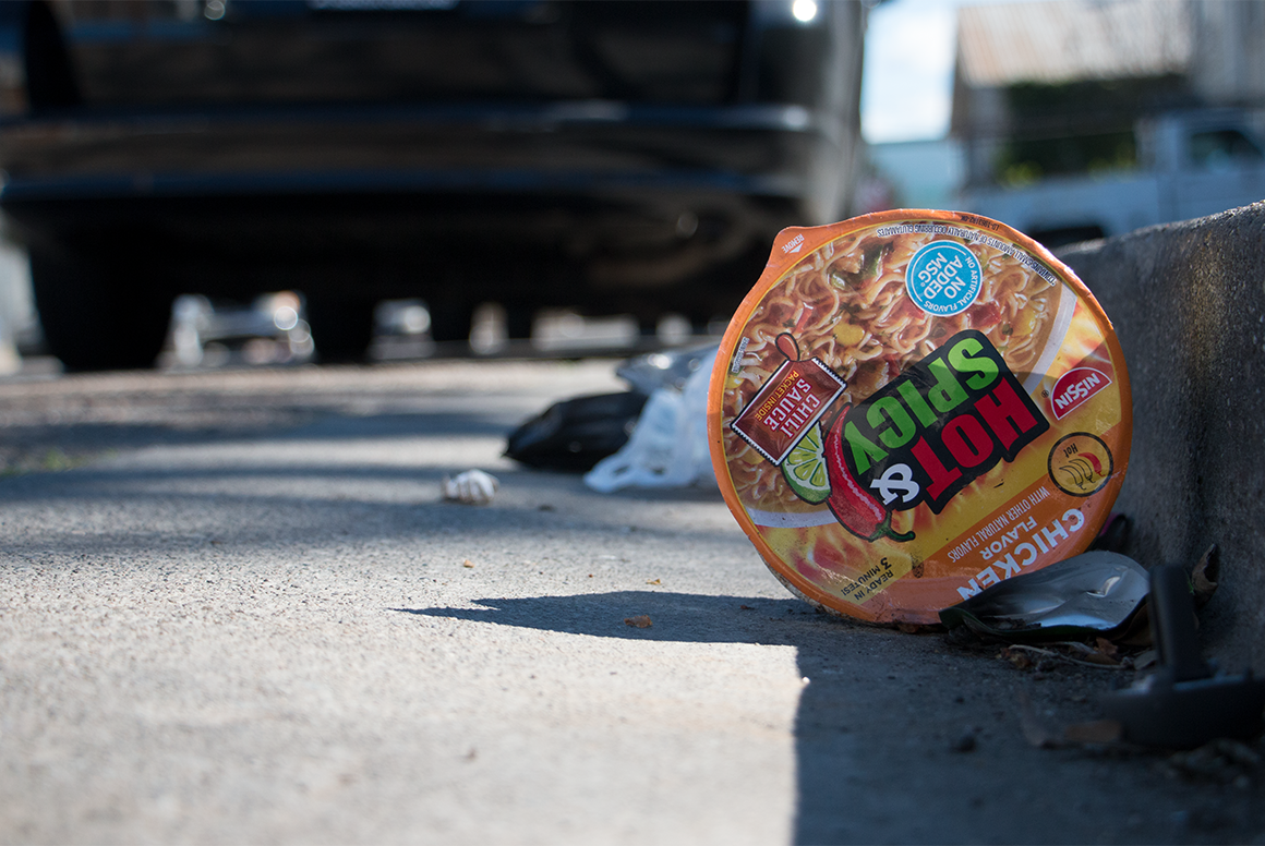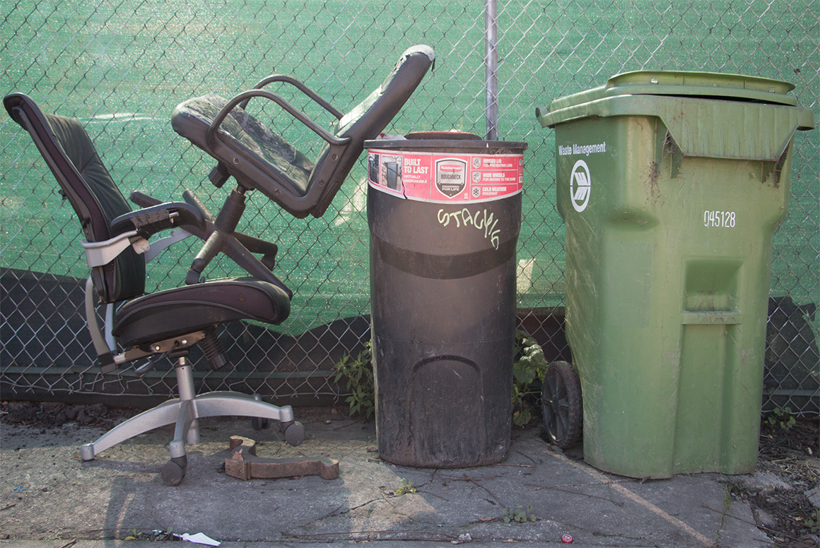 The street is currently decorated with a variety of trash. On the sidewalk are abandoned office chairs, trash bins, boxes with office materials, and boxes with even more trash. A 7-Eleven Slurpee cup, empty Sriracha packages and instant noodle cups line the corner of the sidewalk and the street. They match well with all the oil stains that the Texas-sized pickup trucks from the people working on the construction area have left behind.