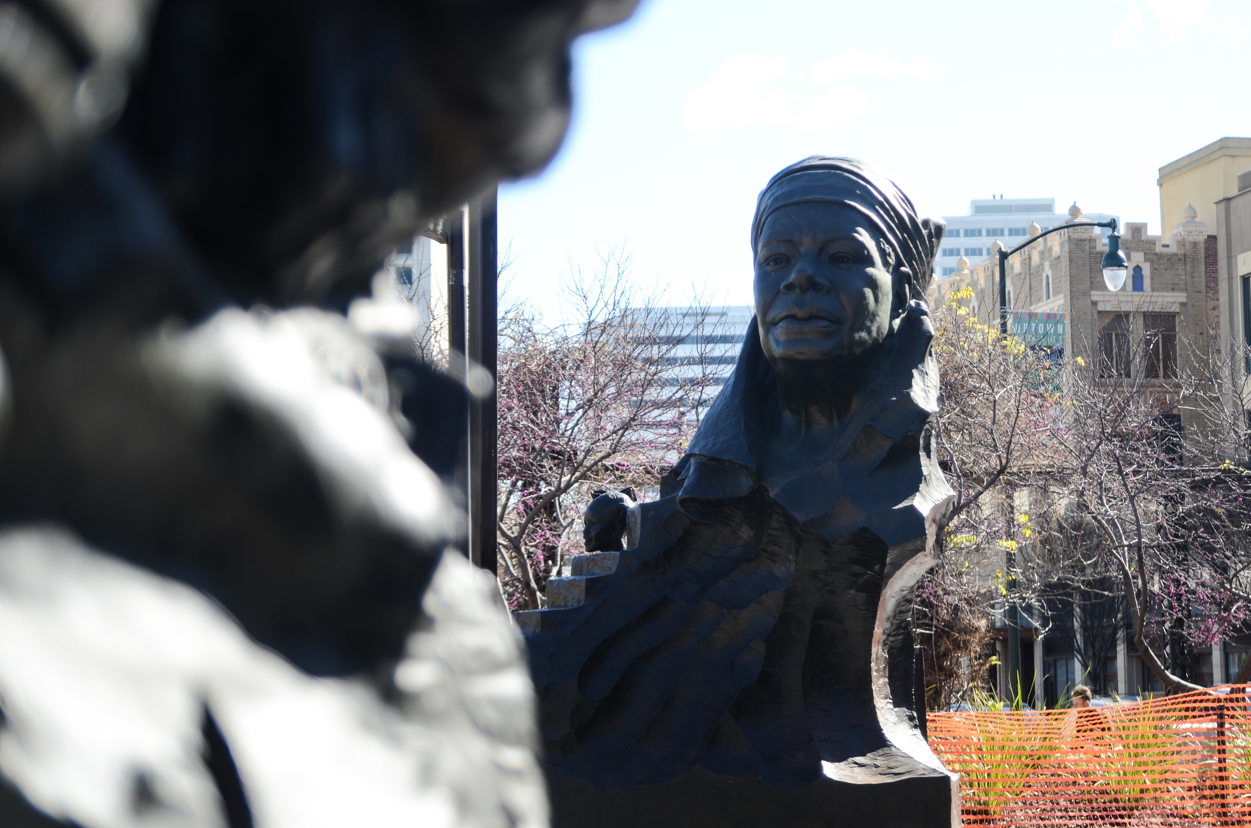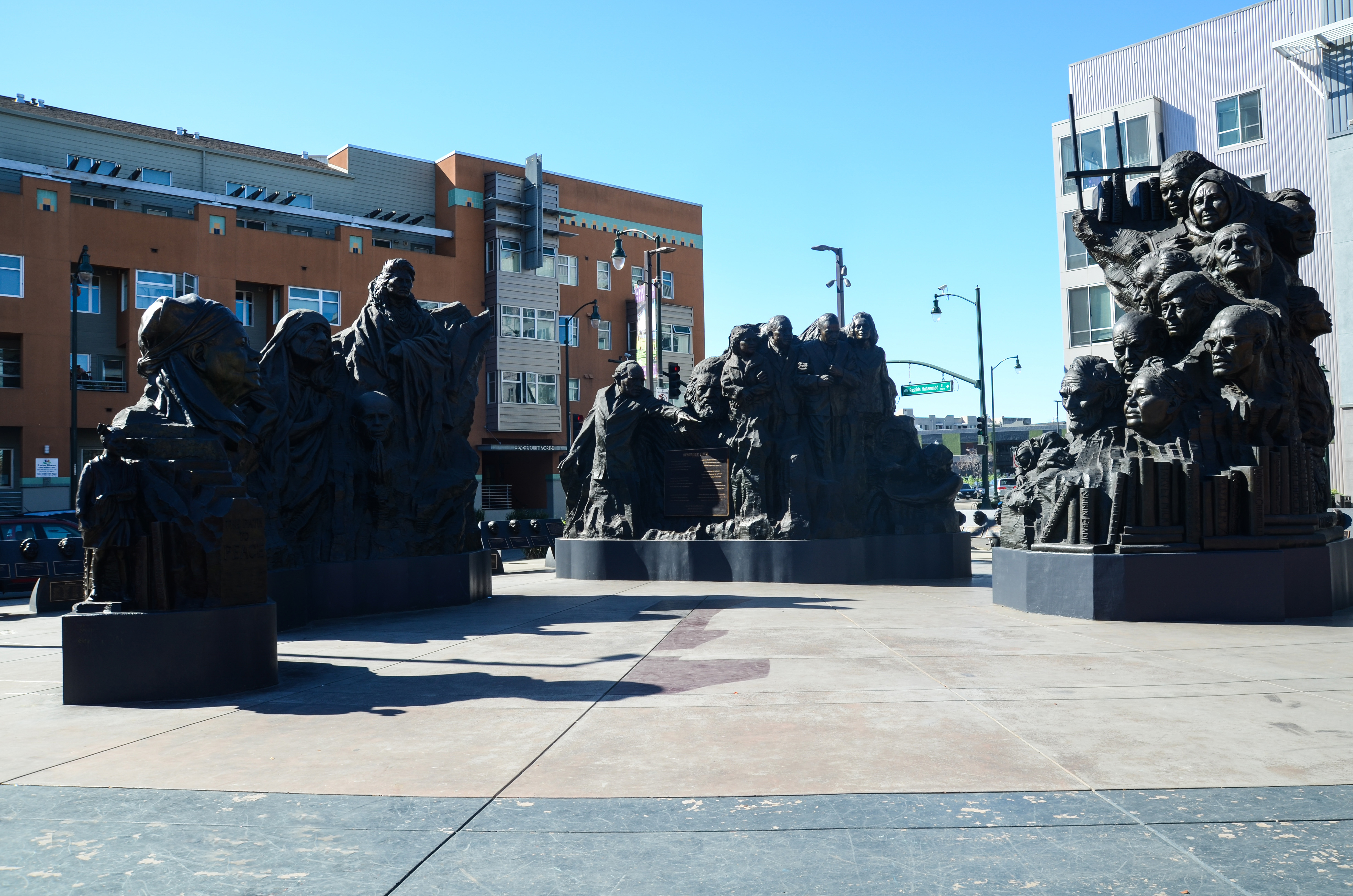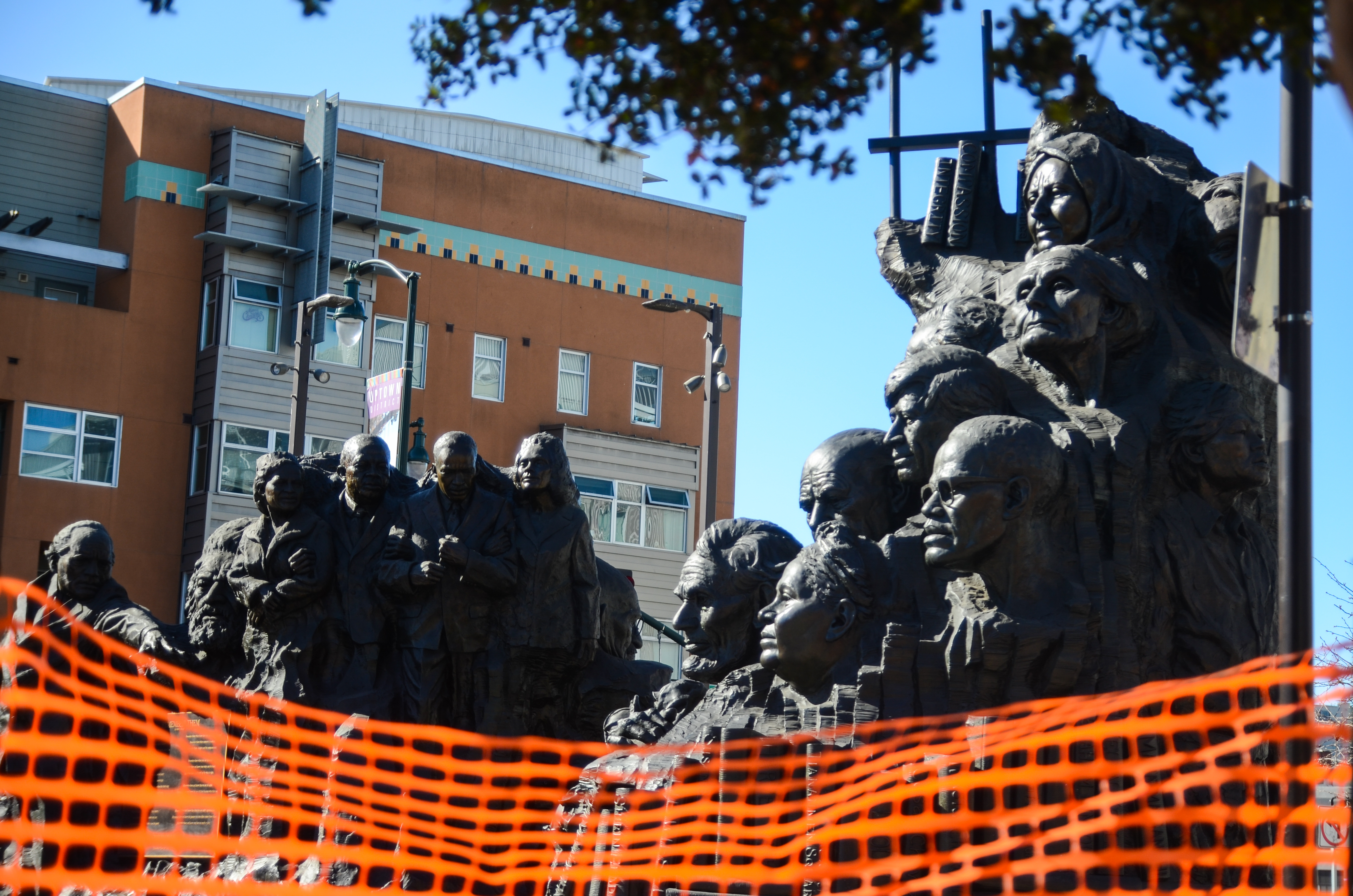 On this Monday morning, there is not a single cloud in the sky. The bronzes shine weakly under a layer of dust fine enough to allow them to catch some rays. Where the sun hits them, they glow—cold as ice in the shadows. Drills bore monotonously at the uncountable construction sites in downtown Oakland in the distance. Every now and then, a plane overflies the city. The most dominant sound is the chirping of a bird and the squeaking electric garage door from the apartment building at Rashida Muhammad Street.
