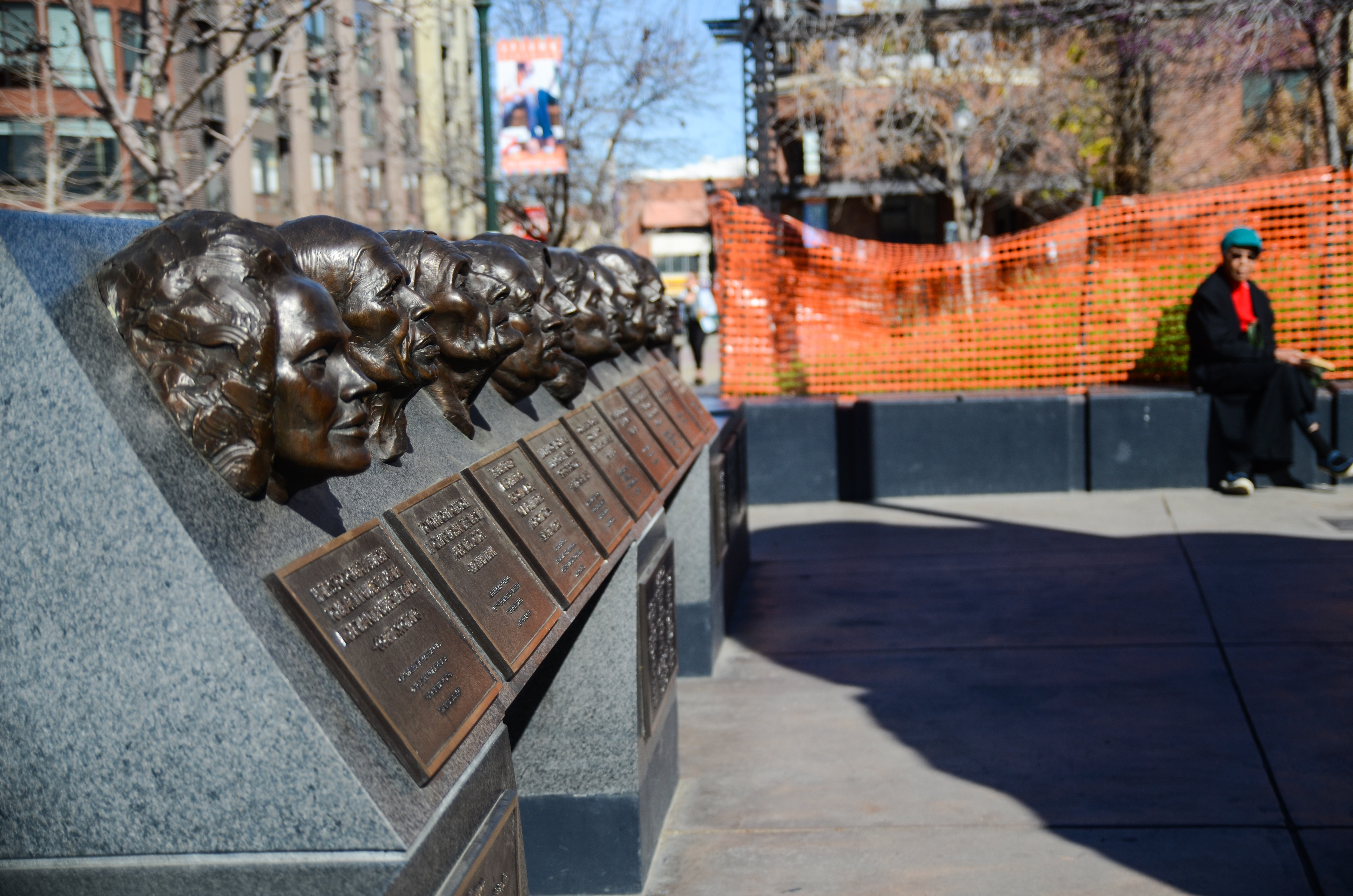It is a very precise place. No plastic bags, no empty bottles, not even in the corners or under the bench. The red plastic edging seems to fence the monument in, to protect it from stranger things. The four bronzes inside are placed symmetrically on two sites framed by a gallery of little busts, bronzed and brushed. Global humanitarians next to local champions: Marcus Foster, Carmen Flores, Oleta Abrams, Fred Korematsu, Rosa Parks, Oskar Schindler, Abraham Lincoln and Nelson Mandela. Proudly, the sculptures honor people in Oakland and around the world who fought for peace, freedom and human rights over the past 150 years.