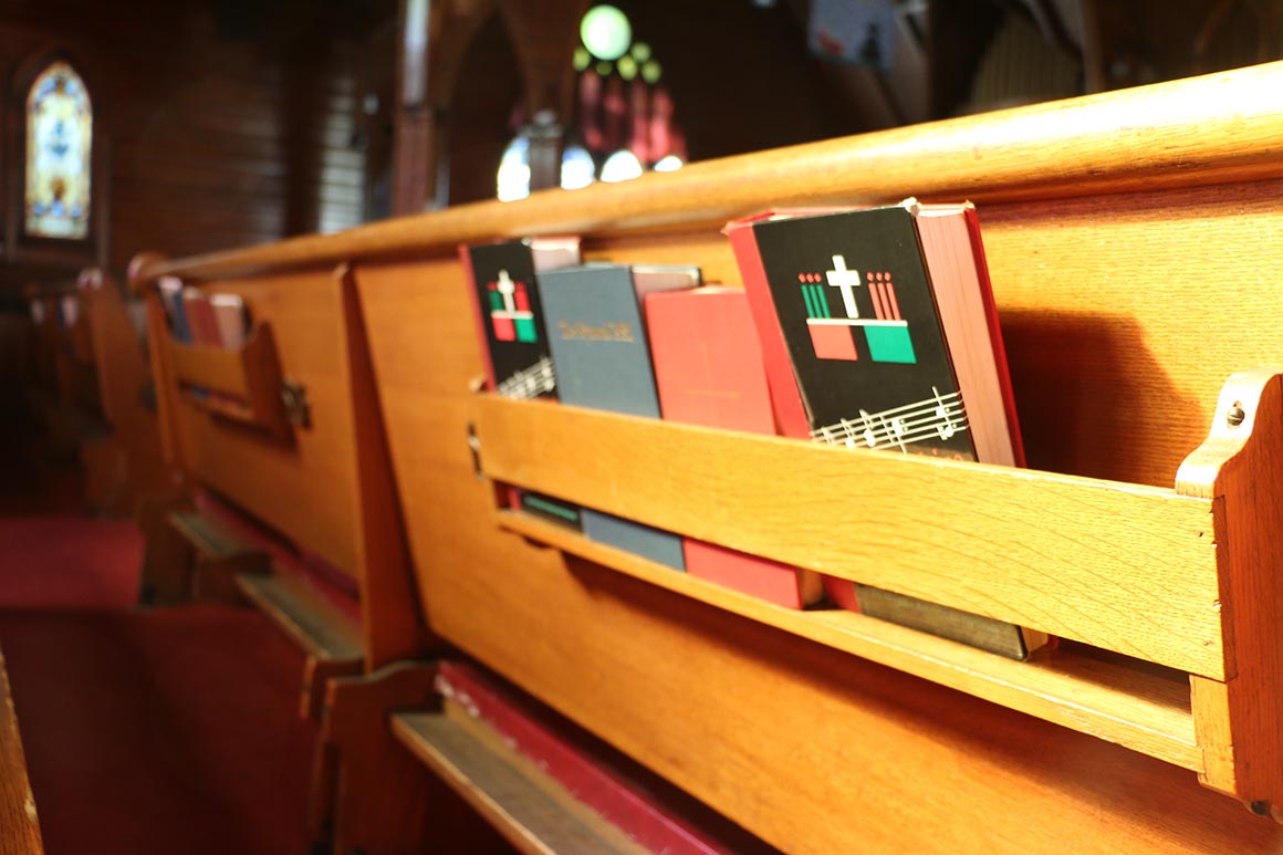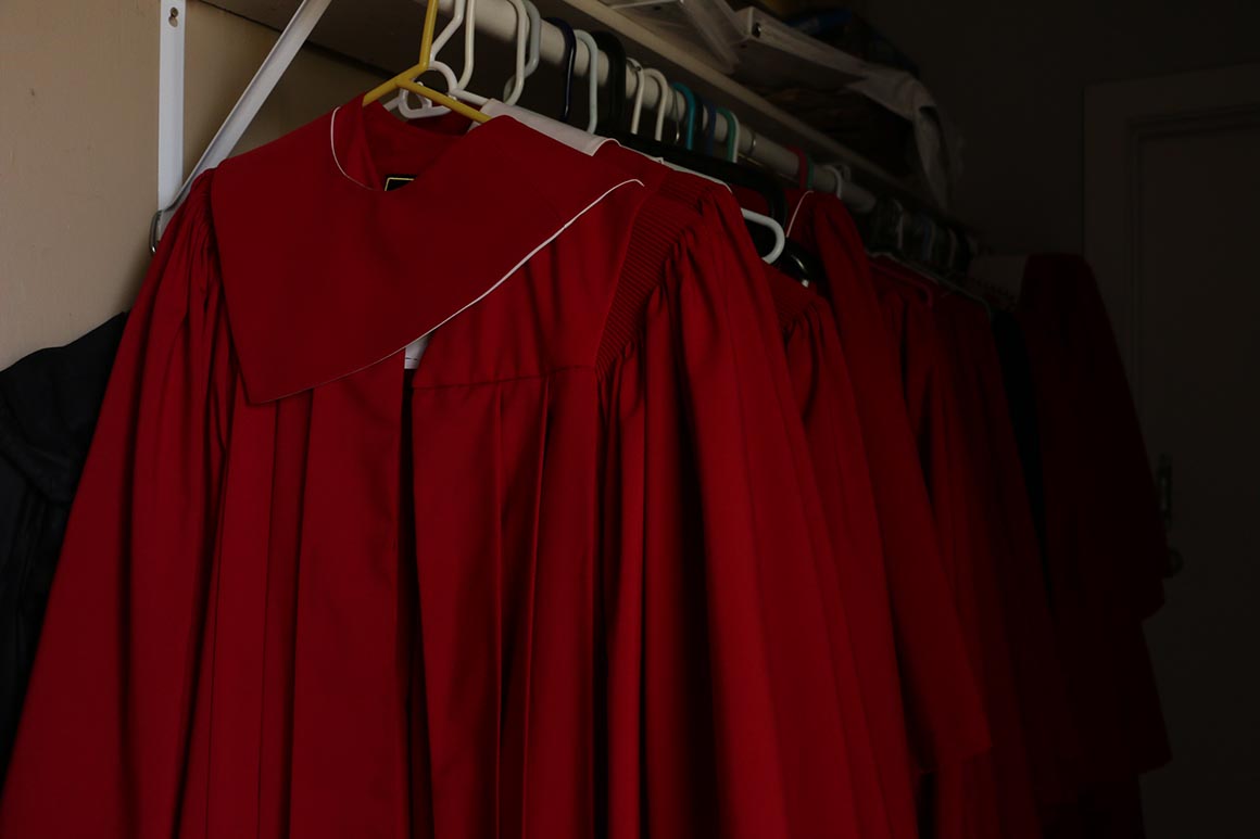 The church smells close and old. The walls silence the street sounds. The color red dresses the interior of the church as well. All the Bibles are prepared in an orderly way, waiting to be read during the next service on Sunday.