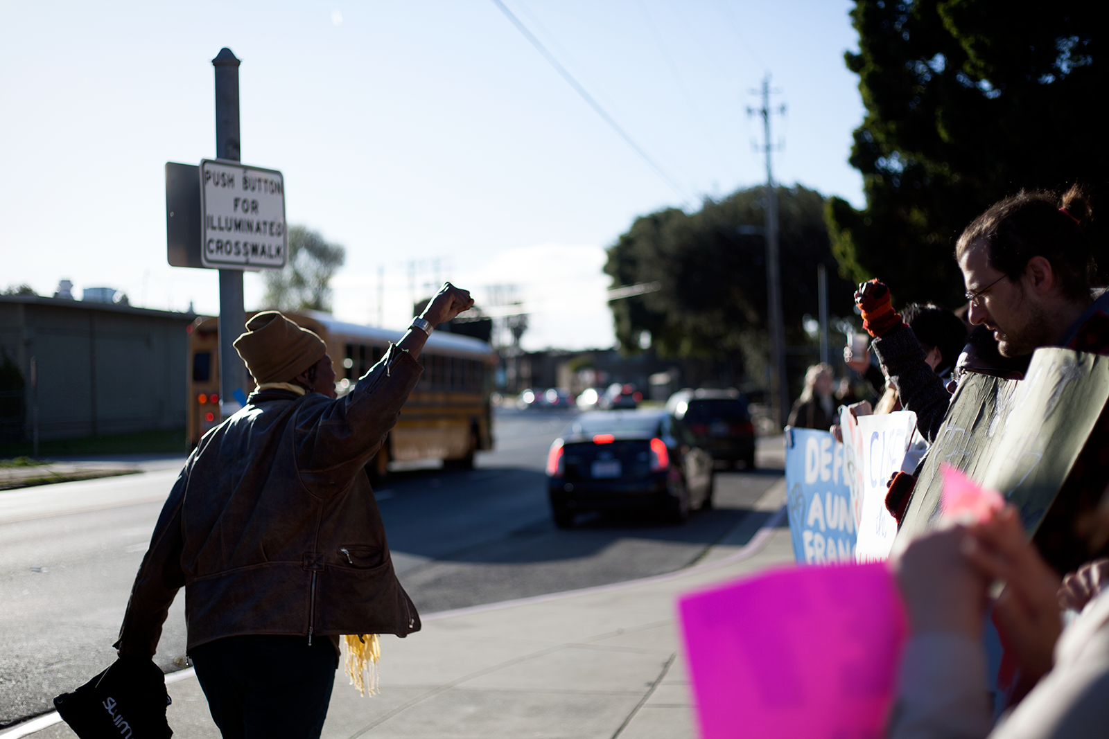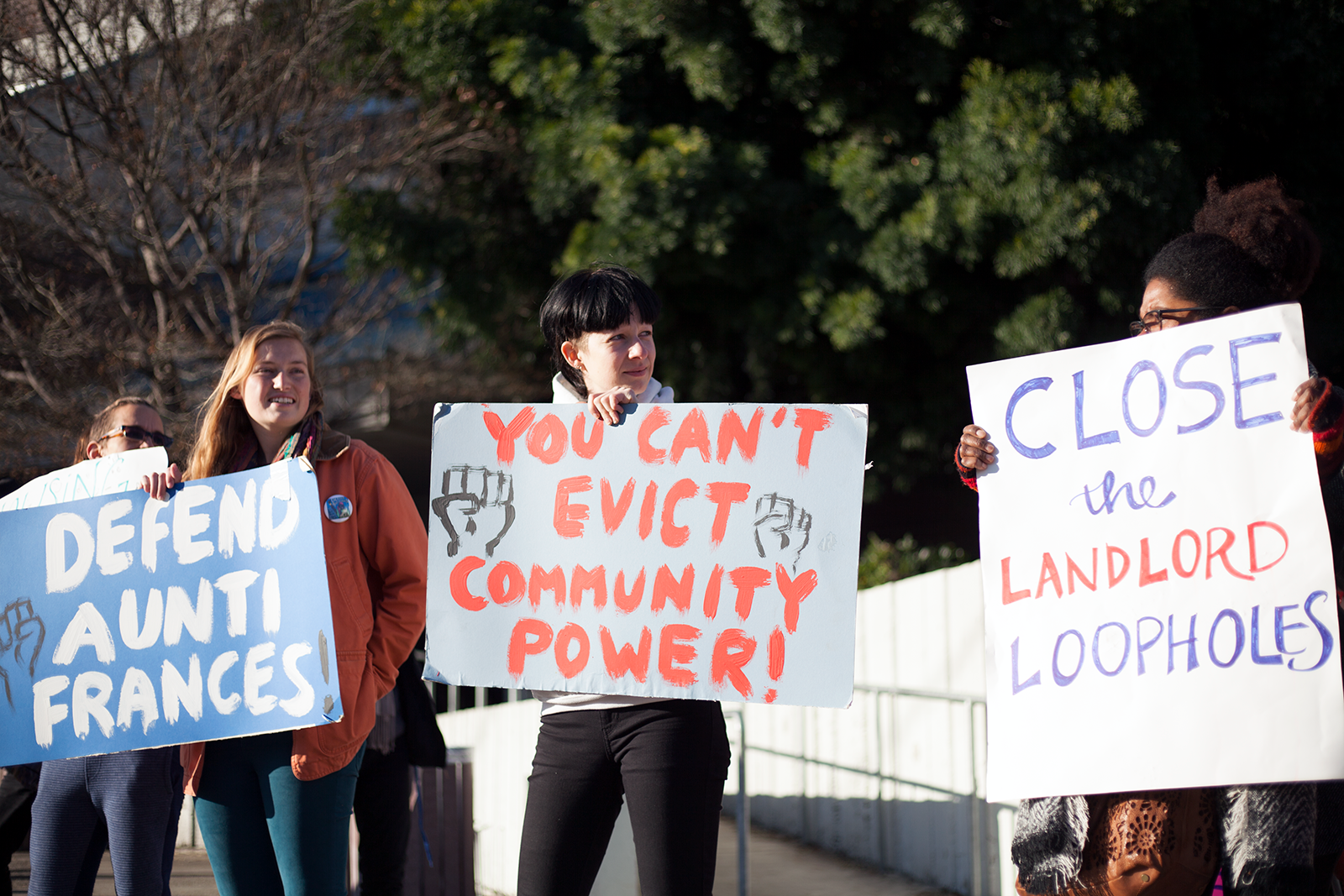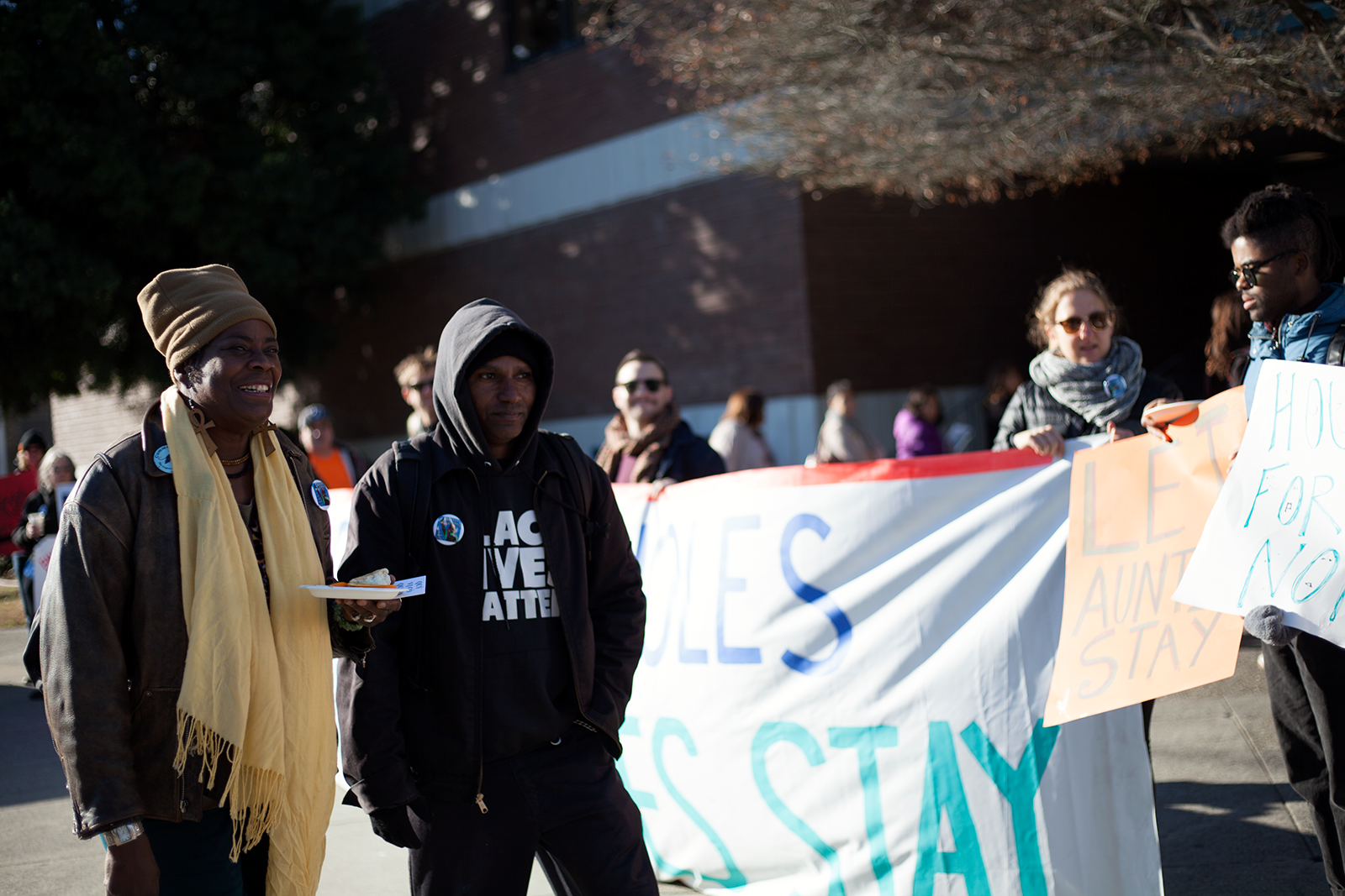 The morning after the council meeting, Moore appeared at the courthouse, a look of astonishment instantly crossing her face as she realized a rally was being held on her behalf. People held signs that read: “You can’t evict community power,” “Oakland loves Aunti Frances,” and “Don’t evict the heart of our community.”