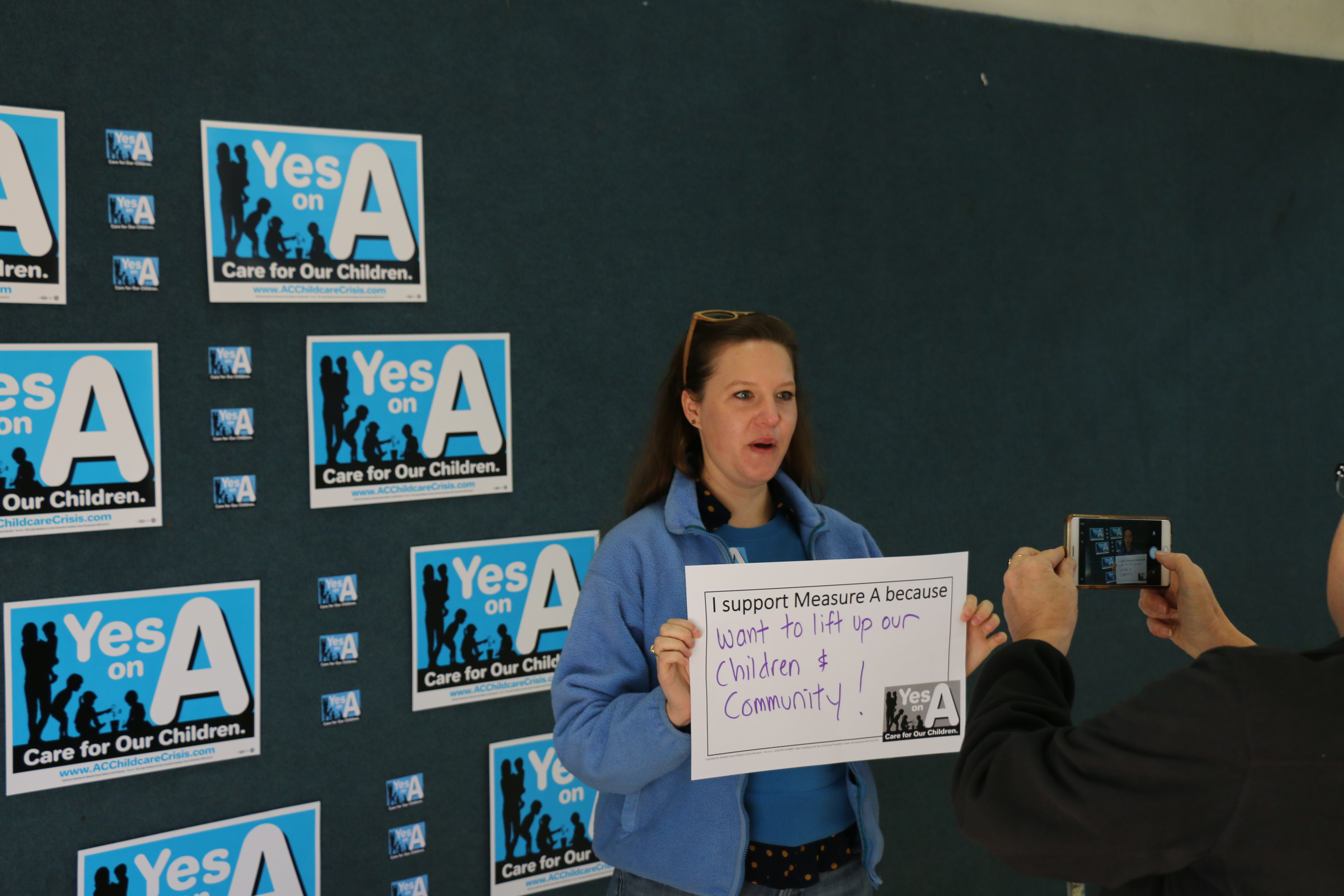- Measure A supporter takes a picture with a sign to show that she is ready to advocate the importance of child care