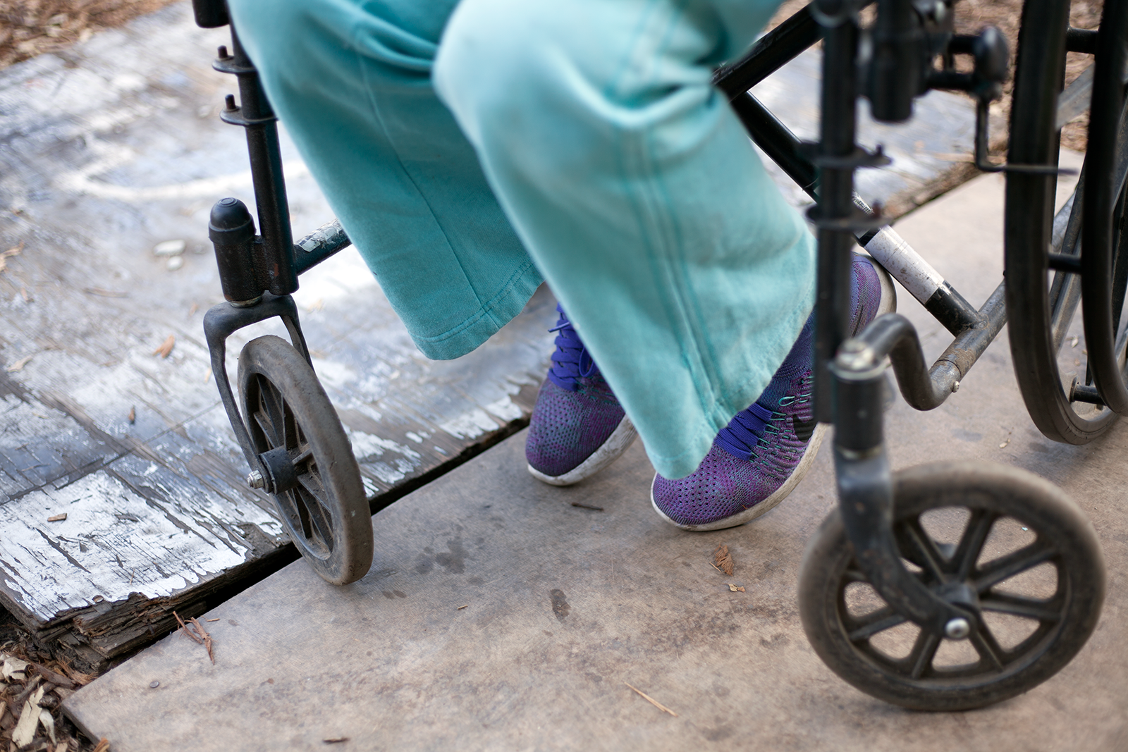 “They built that ramp for me. It [the house] didn’t have a ramp at first, but since I’m in a wheelchair they built that little ramp,” says Verduzco, gesturing toward the dark brown plywood ramp she’s sitting on. “I hate this wheelchair.”