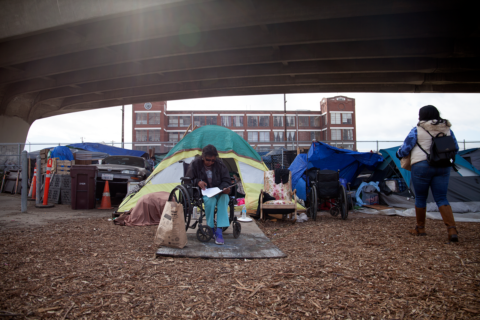 - In February 2018, Verduzco sits outside her tent, filling out a form given to her by a social worker, as a volunteer passes out meals to other residents. (Photo by Caron Creighton)
