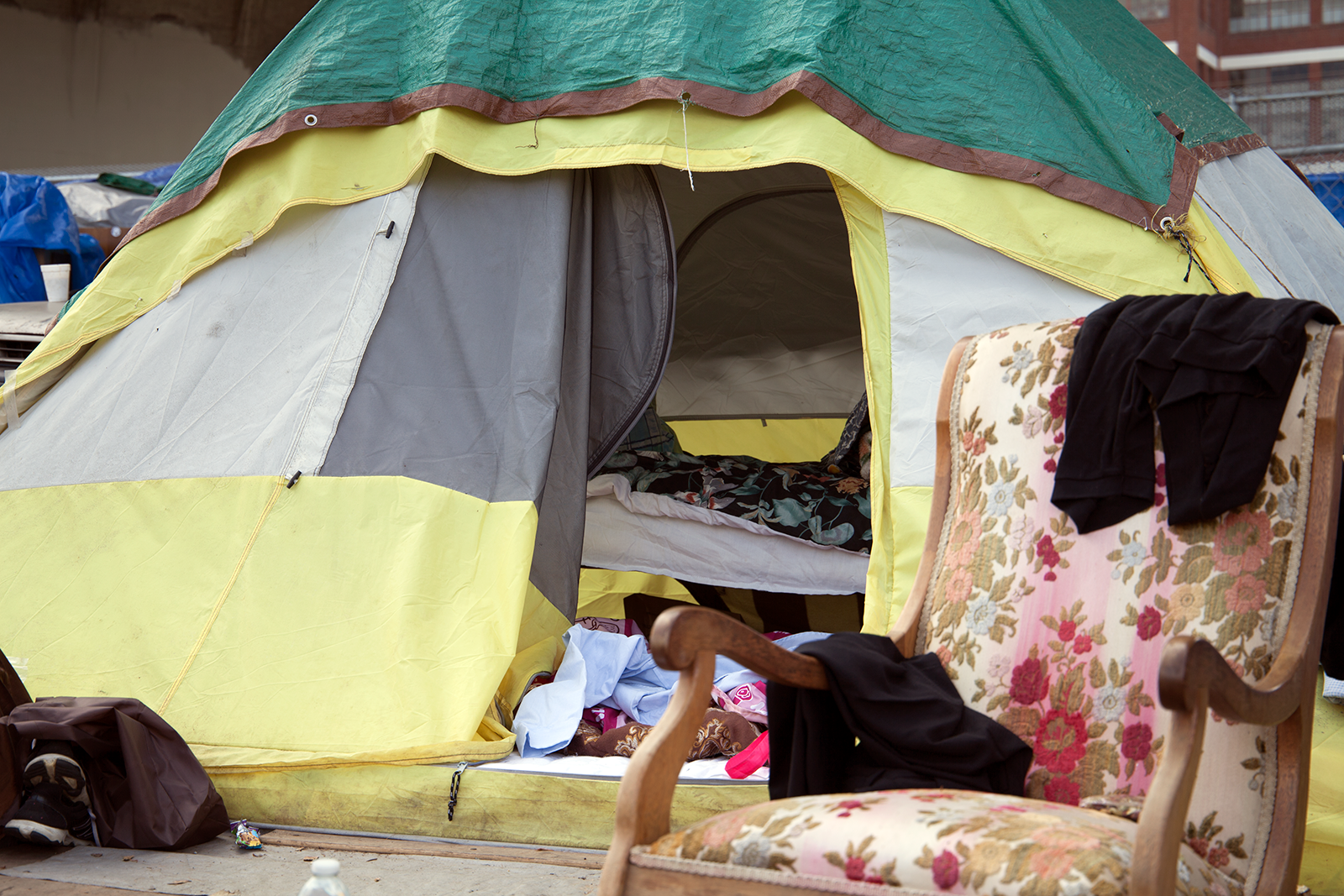 Verduzco has been homeless for eight months, and said that moving to The Village was the first time she’d had to live in a tent. She has trouble walking because of severe arthritis in her knees, and spends most of the time in her wheelchair. It can be difficult for her to get around The Village, since the ground is covered in mulch, and the otherwise simple task of crossing the yard to use the bathroom–a portable toilet that’s maintained by the city–becomes even more difficult in rainy weather. “I need help,” says Verduzco. “My back tire always gets stuck in the mulch.”