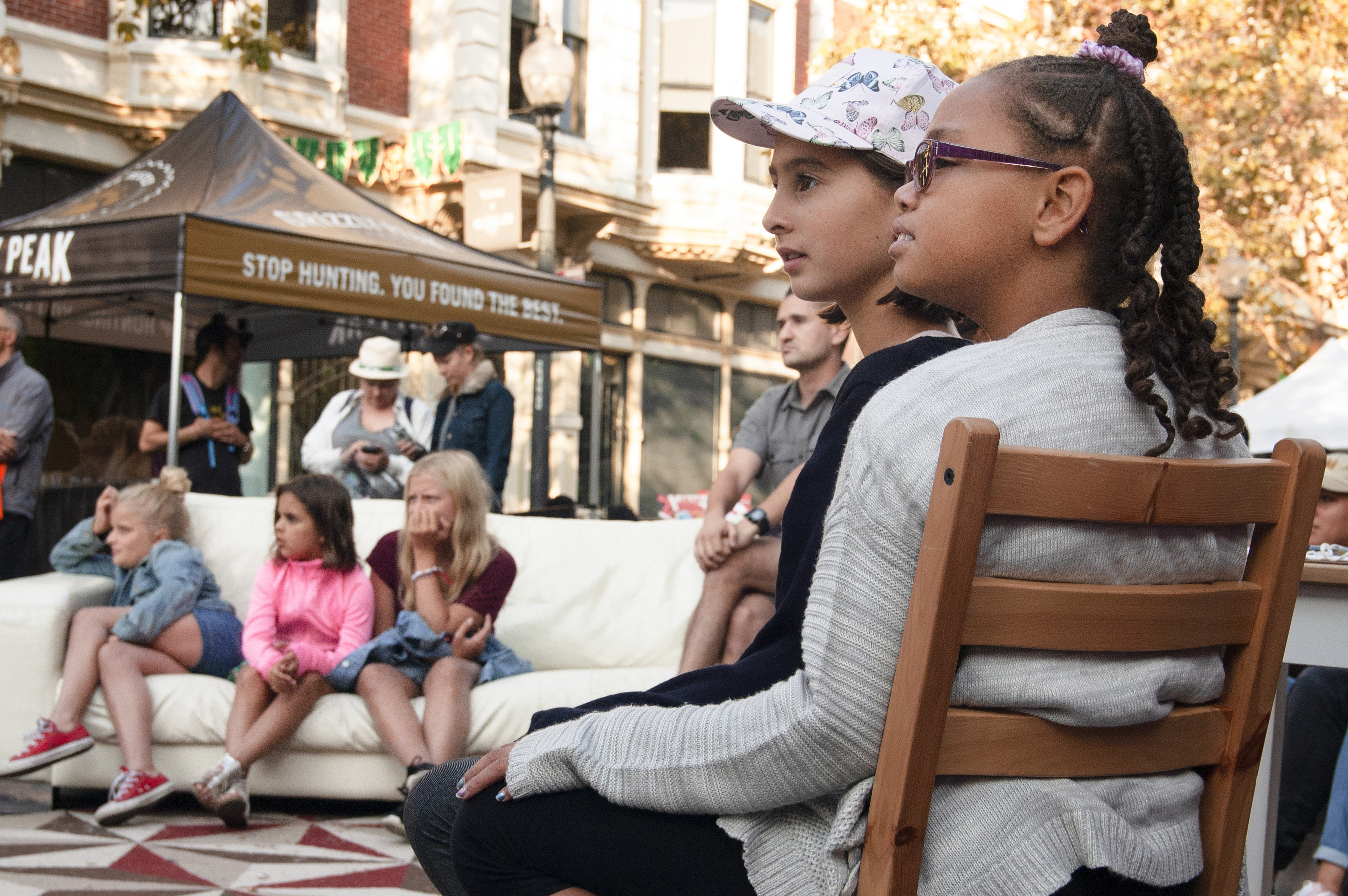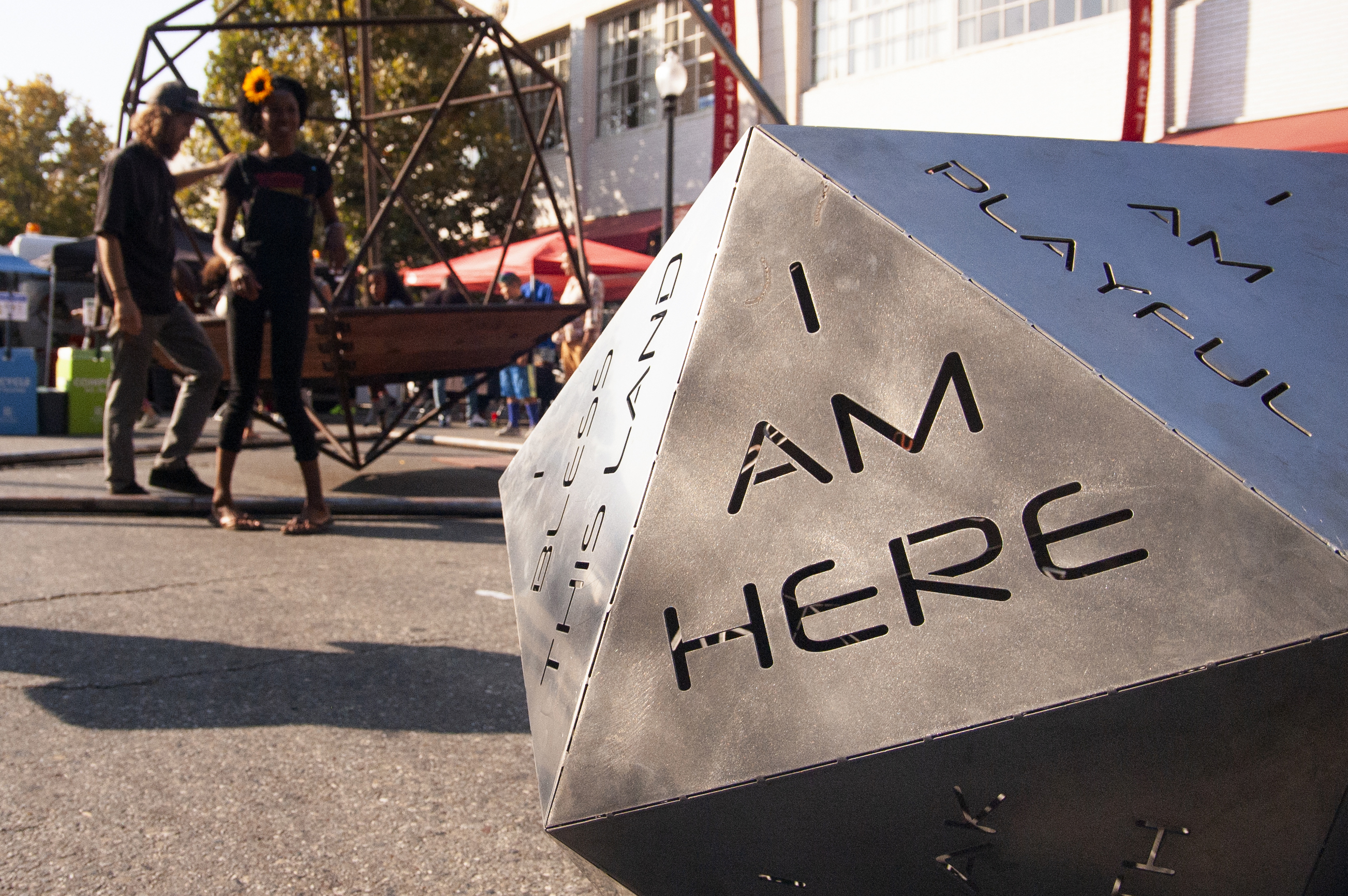 Further up 9th Street, San Francisco artist Tanya Herrera burned typography into the side of a single leather shoe—“Never Not Chilling”—while Arthur Monroe took a nap in the sun surrounded by old friends in town for the festival. Oakland’s DJ Leydis spun beats from her booth behind the stage, facing the artists of FR33FORM who had set up a giant metal swing—really a pendulum with a ring of wooden seats—and two “matrahedrons,” metal sculptures that resembled giant 20-sided dice. On each side of the sculptures, a mantra had been punched out of the metal: “I See Beauty.” “I Am Love.” And, most fitting for Monroe’s vision of the event, which he aims to expand and produce again: “I Am Here.”
