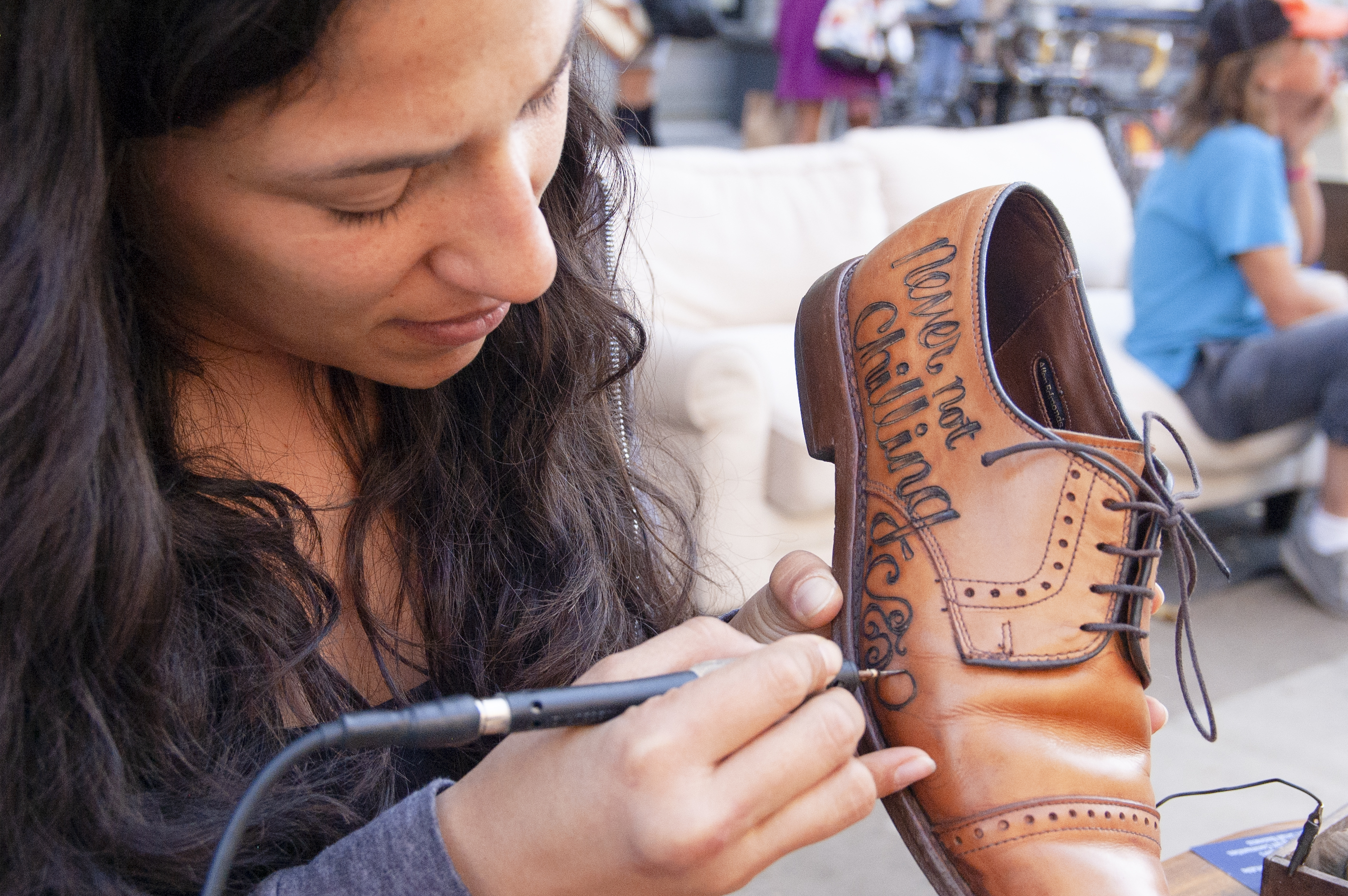 - San Francisco artist Tanya Herrera shows off her “pyrography” work on a leather shoe.