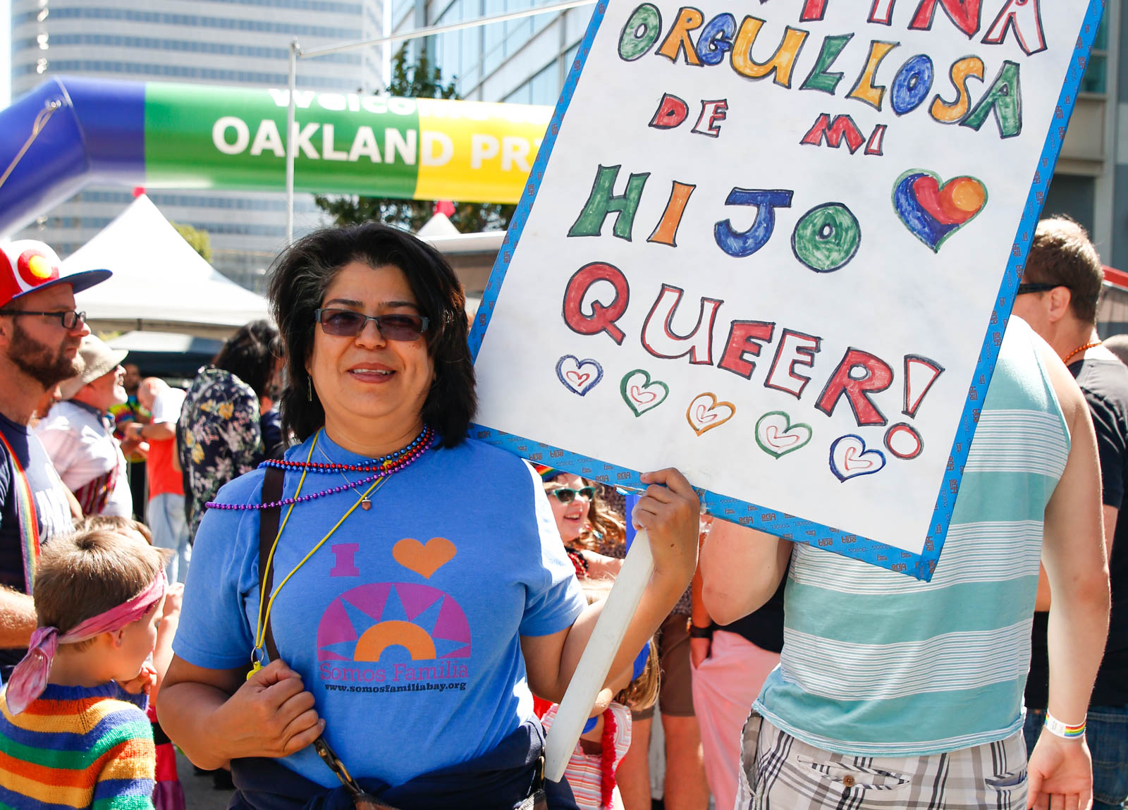 - Mirna Medina, co-founder of Somos Familia, holding a sign at 2018 Oakland Pride that reads “Latina Orgullosa de mi Hijo Queer” (“Latina Proud of my Queer Son”).