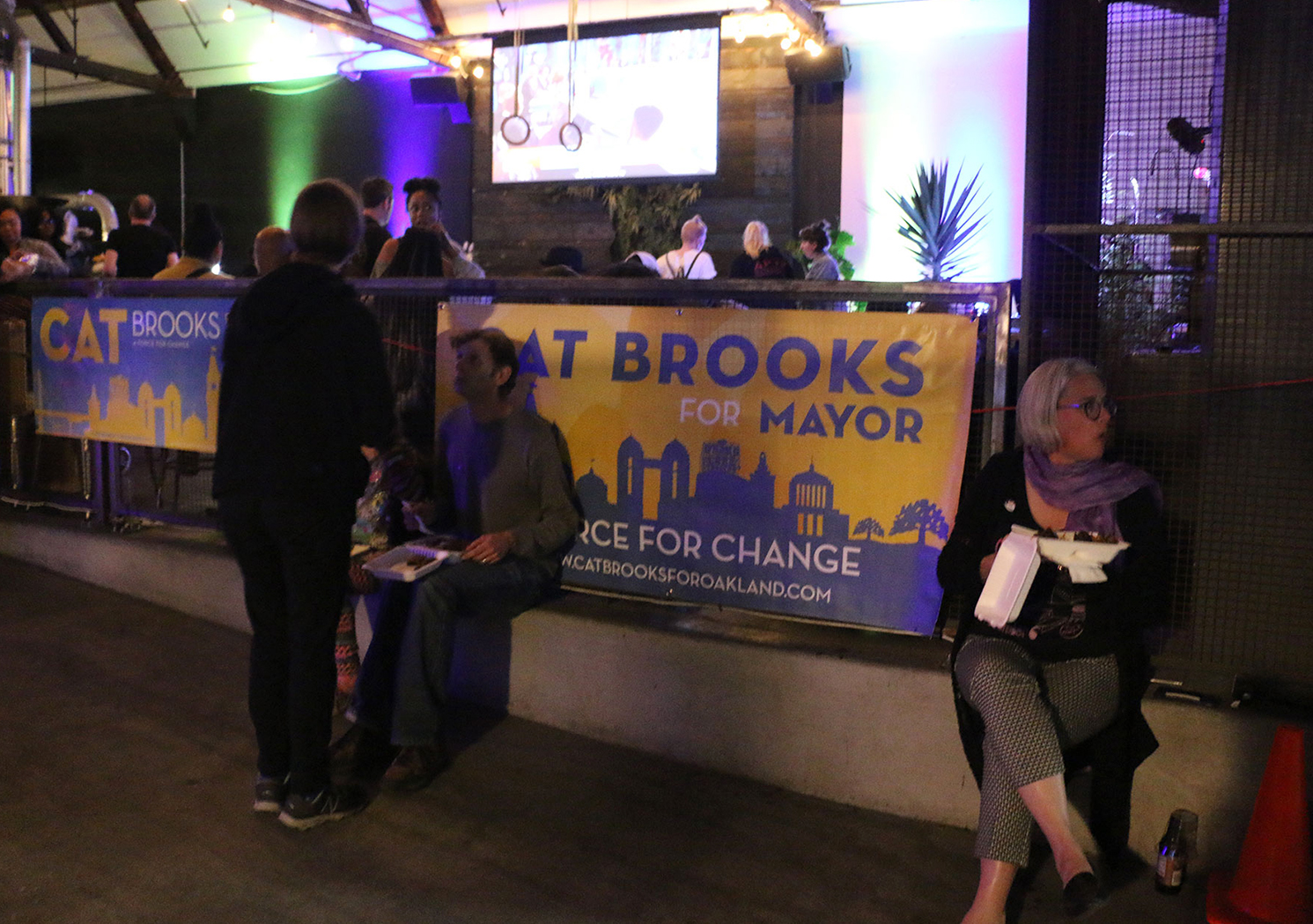 Meanwhile, a few dozen Brooks supporters were donning campaign shirts and eating treats from food trucks in the Fruitvale while waiting for the candidate to arrive soon after polls closed. Inside her party at Red Bay Coffee, a projector played the news overhead while a DJ played smooth jazz.